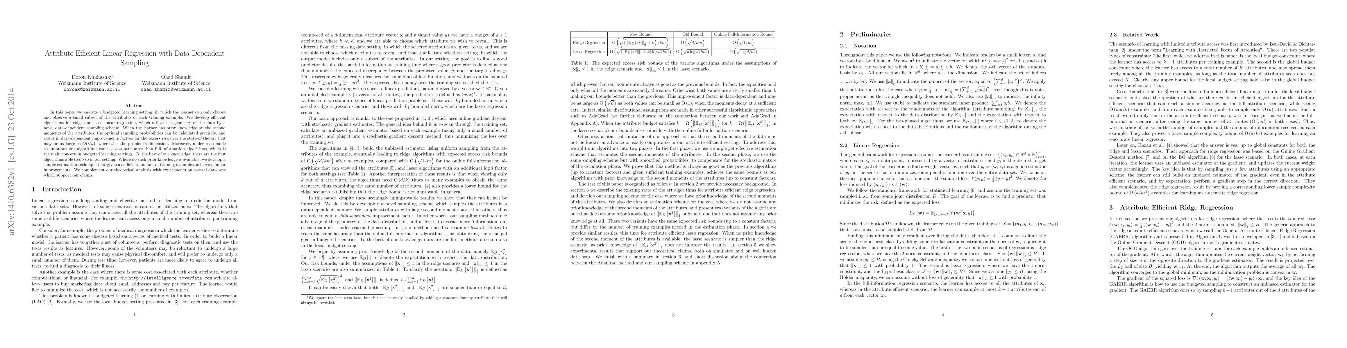 In this paper we analyze a budgeted learning setting, in which the learner can only choose and observe a small subset of the attributes of each training example. We develop efficient algorithms for ridge and lasso linear regression, which utilize the geometry of the data by a novel data-dependent sampling scheme. When the learner has prior knowledge on the second moments of the attributes, the optimal sampling probabilities can be calculated precisely, and result in data-dependent improvements factors for the excess risk over the state-of-the-art that may be as large as $O(\sqrt{d})$, where $d$ is the problem's dimension. Moreover, under reasonable assumptions our algorithms can use less attributes than full-information algorithms, which is the main concern in budgeted learning settings. To the best of our knowledge, these are the first algorithms able to do so in our setting. Where no such prior knowledge is available, we develop a simple estimation technique that given a sufficient amount of training examples, achieves similar improvements. We complement our theoretical analysis with experiments on several data sets which support our claims.