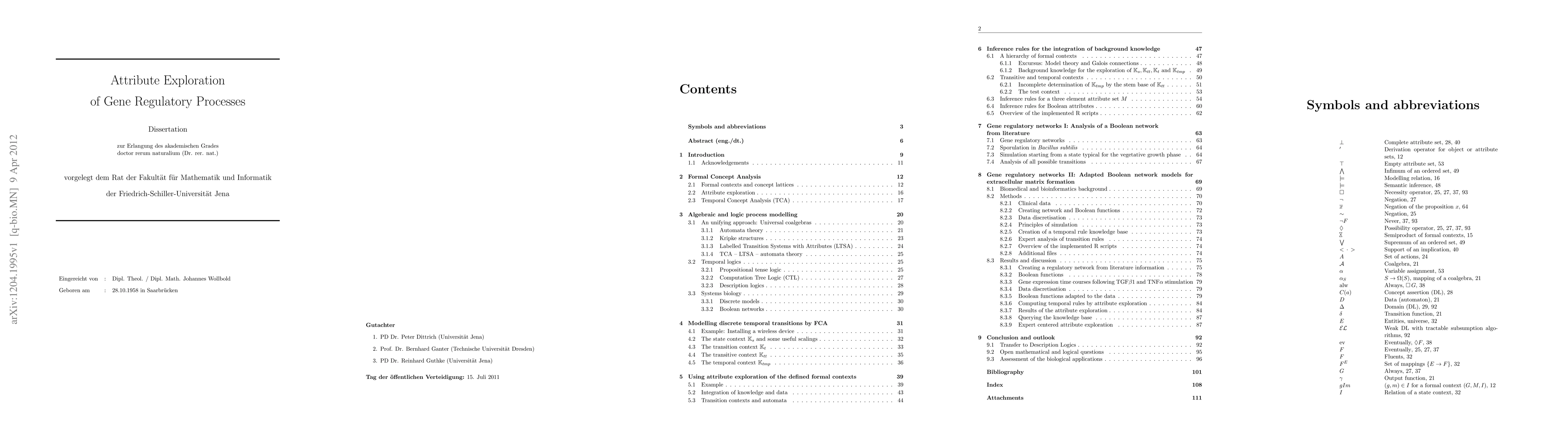 This thesis aims at the logical analysis of discrete processes, in particular of such generated by gene regulatory networks. States, transitions and operators from temporal logics are expressed in the language of Formal Concept Analysis. By the attribute exploration algorithm, an expert or a computer program is enabled to validate a minimal and complete set of implications, e.g. by comparison of predictions derived from literature with observed data. Here, these rules represent temporal dependencies within gene regulatory networks including coexpression of genes, reachability of states, invariants or possible causal relationships. This new approach is embedded into the theory of universal coalgebras, particularly automata, Kripke structures and Labelled Transition Systems. A comparison with the temporal expressivity of Description Logics is made. The main theoretical results concern the integration of background knowledge into the successive exploration of the defined data structures (formal contexts). Applying the method a Boolean network from literature modelling sporulation of Bacillus subtilis is examined. Finally, we developed an asynchronous Boolean network for extracellular matrix formation and destruction in the context of rheumatoid arthritis.