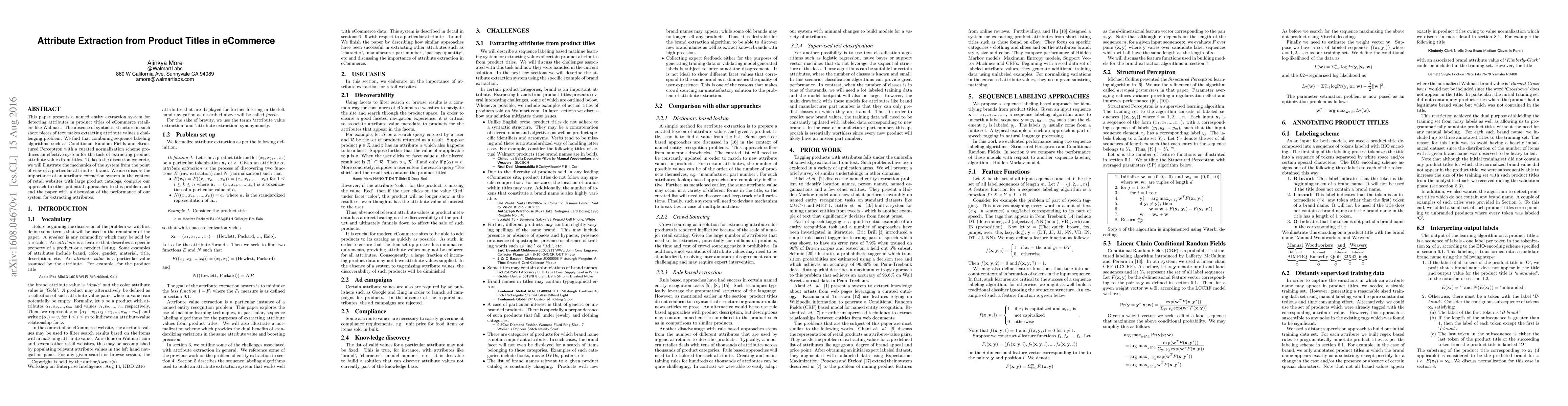 This paper presents a named entity extraction system for detecting attributes in product titles of eCommerce retailers like Walmart. The absence of syntactic structure in such short pieces of text makes extracting attribute values a challenging problem. We find that combining sequence labeling algorithms such as Conditional Random Fields and Structured Perceptron with a curated normalization scheme produces an effective system for the task of extracting product attribute values from titles. To keep the discussion concrete, we will illustrate the mechanics of the system from the point of view of a particular attribute - brand. We also discuss the importance of an attribute extraction system in the context of retail websites with large product catalogs, compare our approach to other potential approaches to this problem and end the paper with a discussion of the performance of our system for extracting attributes.
