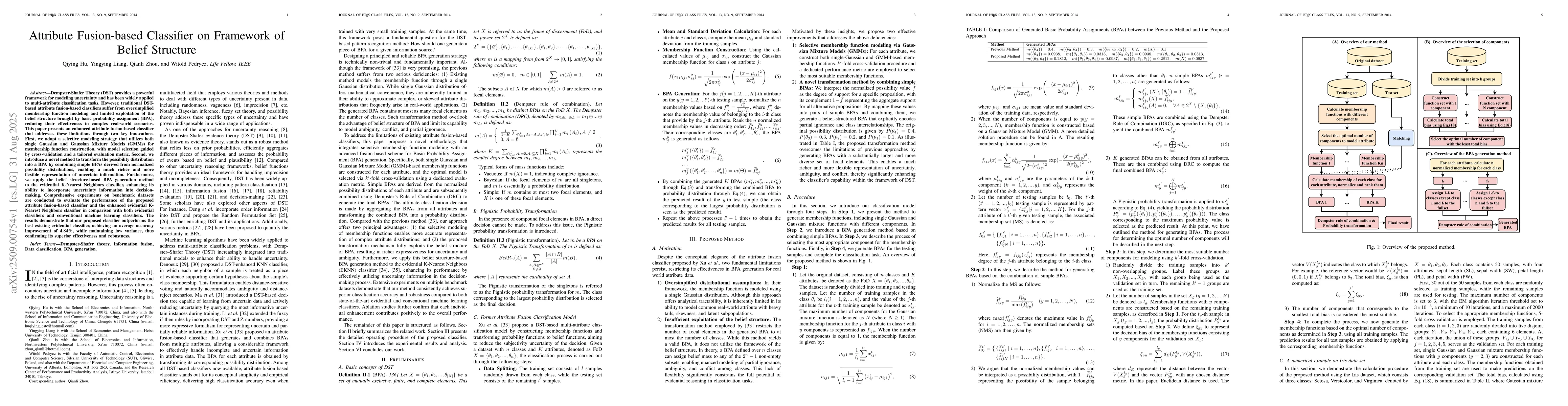 Dempster-Shafer Theory (DST) provides a powerful framework for modeling uncertainty and has been widely applied to multi-attribute classification tasks. However, traditional DST-based attribute fusion-based classifiers suffer from oversimplified membership function modeling and limited exploitation of the belief structure brought by basic probability assignment (BPA), reducing their effectiveness in complex real-world scenarios. This paper presents an enhanced attribute fusion-based classifier that addresses these limitations through two key innovations. First, we adopt a selective modeling strategy that utilizes both single Gaussian and Gaussian Mixture Models (GMMs) for membership function construction, with model selection guided by cross-validation and a tailored evaluation metric. Second, we introduce a novel method to transform the possibility distribution into a BPA by combining simple BPAs derived from normalized possibility distributions, enabling a much richer and more flexible representation of uncertain information. Furthermore, we apply the belief structure-based BPA generation method to the evidential K-Nearest Neighbors classifier, enhancing its ability to incorporate uncertainty information into decision-making. Comprehensive experiments on benchmark datasets are conducted to evaluate the performance of the proposed attribute fusion-based classifier and the enhanced evidential K-Nearest Neighbors classifier in comparison with both evidential classifiers and conventional machine learning classifiers. The results demonstrate that our proposed classifier outperforms the best existing evidential classifier, achieving an average accuracy improvement of 4.84%, while maintaining low variance, thus confirming its superior effectiveness and robustness.