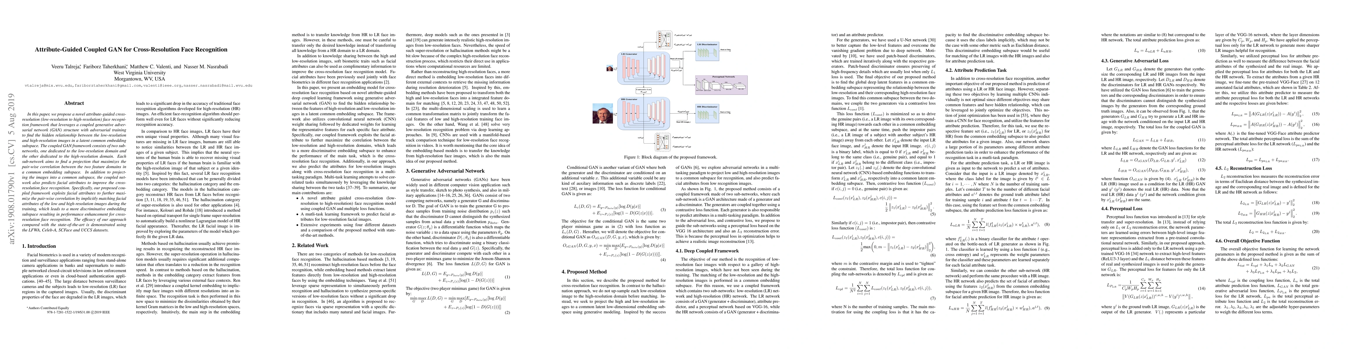This paper proposes an attribute-guided coupled GAN framework for enhancing cross-resolution face recognition by leveraging a shared latent embedding space and facial attributes to improve the correlation between low-resolution and high-resolution images. The approach outperforms state-of-the-art methods on several datasets.