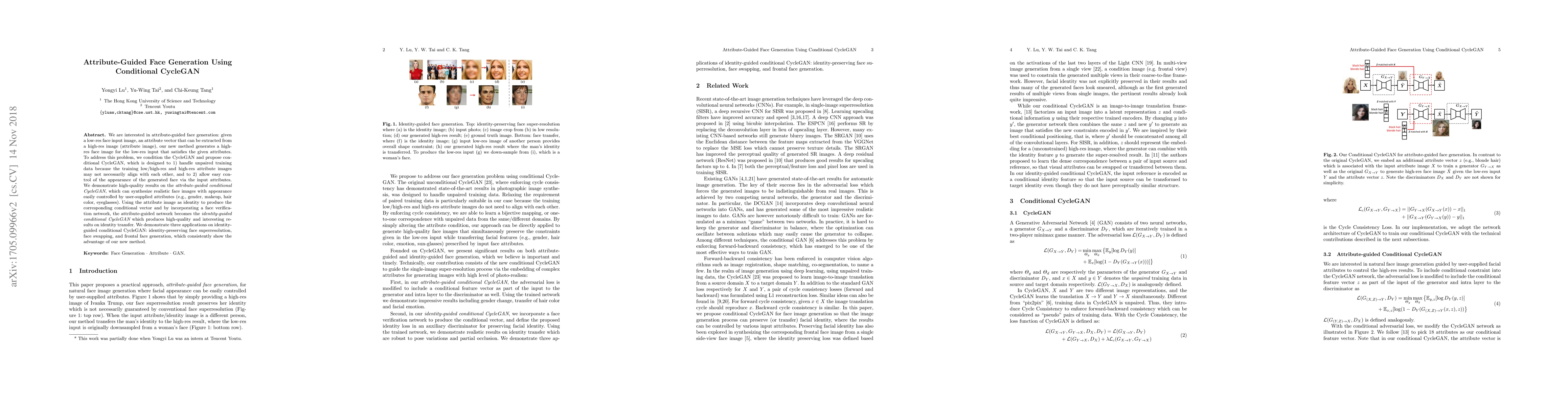 We are interested in attribute-guided face generation: given a low-res face input image, an attribute vector that can be extracted from a high-res image (attribute image), our new method generates a high-res face image for the low-res input that satisfies the given attributes. To address this problem, we condition the CycleGAN and propose conditional CycleGAN, which is designed to 1) handle unpaired training data because the training low/high-res and high-res attribute images may not necessarily align with each other, and to 2) allow easy control of the appearance of the generated face via the input attributes. We demonstrate impressive results on the attribute-guided conditional CycleGAN, which can synthesize realistic face images with appearance easily controlled by user-supplied attributes (e.g., gender, makeup, hair color, eyeglasses). Using the attribute image as identity to produce the corresponding conditional vector and by incorporating a face verification network, the attribute-guided network becomes the identity-guided conditional CycleGAN which produces impressive and interesting results on identity transfer. We demonstrate three applications on identity-guided conditional CycleGAN: identity-preserving face superresolution, face swapping, and frontal face generation, which consistently show the advantage of our new method.