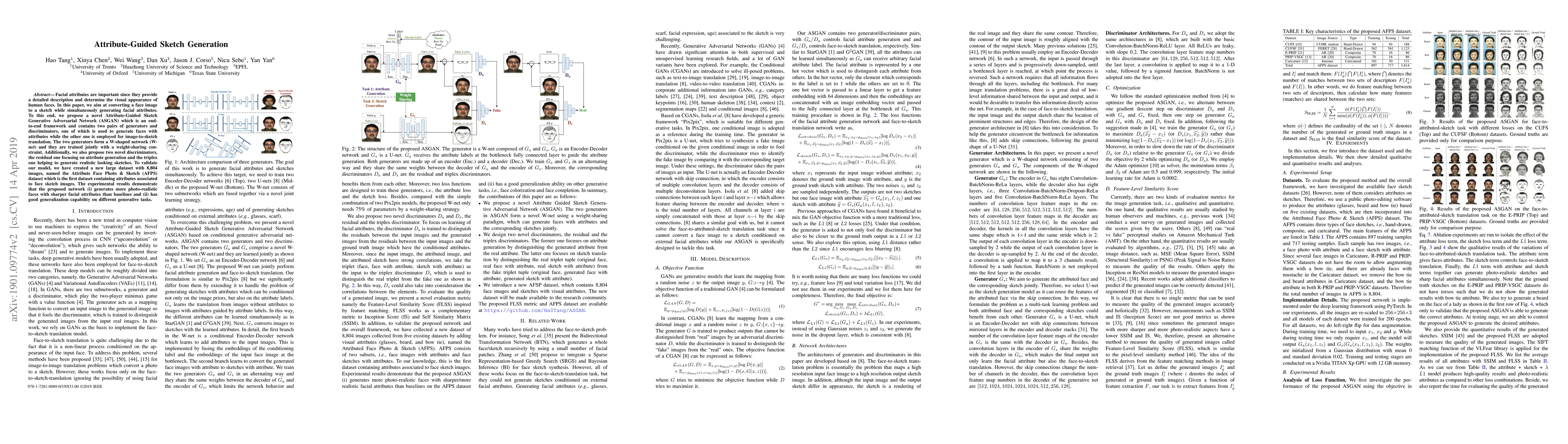 This paper proposes an Attribute-Guided Sketch Generative Adversarial Network (ASGAN) to convert face images into sketches while generating facial attributes. The model uses a W-shaped network with shared weights and two novel discriminators to produce realistic sketches and attributes, validated on a new dataset, AFPS.