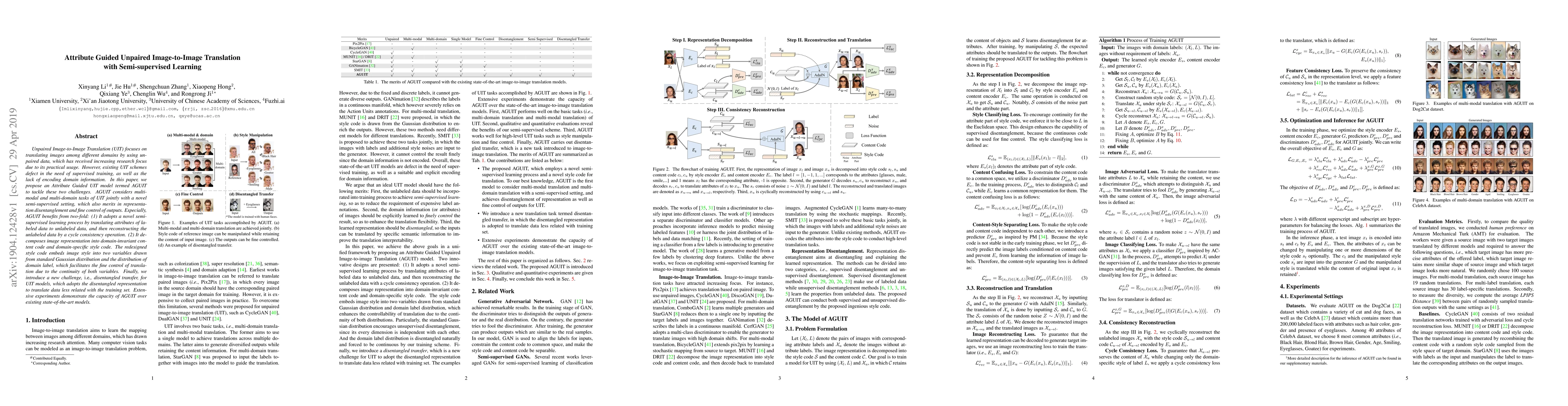 This paper proposes an Attribute Guided Unpaired Image-to-Image Translation (AGUIT) model that uses semi-supervised learning to address the challenges of existing unpaired translation methods. AGUIT disentangles image representations into domain-invariant and domain-specific components, enabling fine control and representation disentanglement.