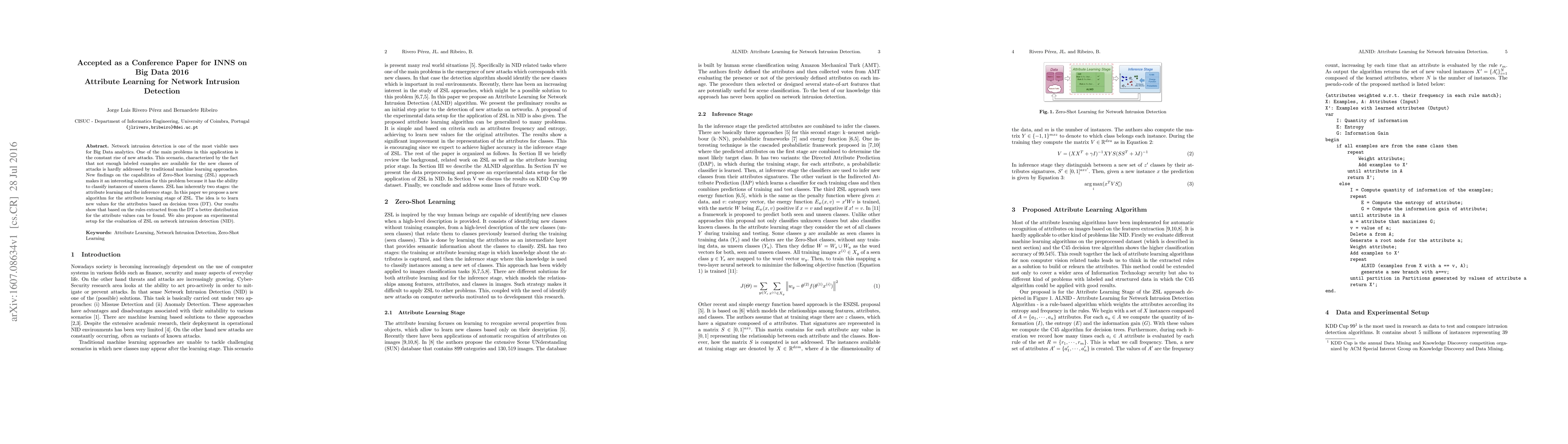 Network intrusion detection is one of the most visible uses for Big Data analytics. One of the main problems in this application is the constant rise of new attacks. This scenario, characterized by the fact that not enough labeled examples are available for the new classes of attacks is hardly addressed by traditional machine learning approaches. New findings on the capabilities of Zero-Shot learning (ZSL) approach makes it an interesting solution for this problem because it has the ability to classify instances of unseen classes. ZSL has inherently two stages: the attribute learning and the inference stage. In this paper we propose a new algorithm for the attribute learning stage of ZSL. The idea is to learn new values for the attributes based on decision trees (DT). Our results show that based on the rules extracted from the DT a better distribution for the attribute values can be found. We also propose an experimental setup for the evaluation of ZSL on network intrusion detection (NID).