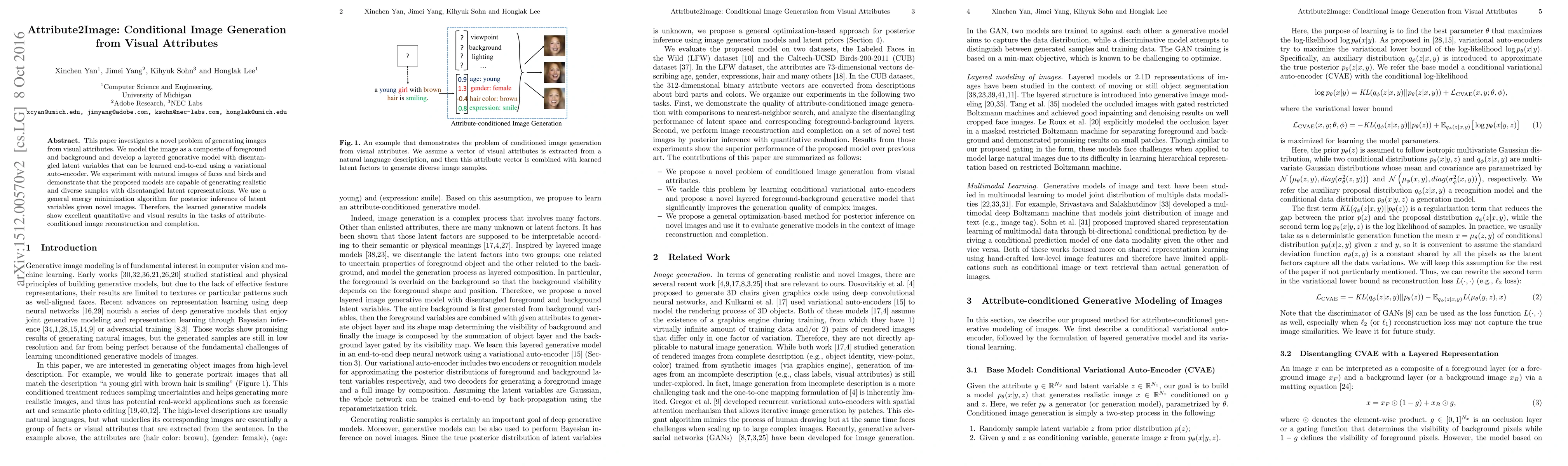 Researchers developed a method to generate images from visual attributes using a layered generative model with disentangled latent variables. The approach produces realistic and diverse samples with excellent quantitative and visual results in attribute-conditioned image reconstruction and completion tasks.