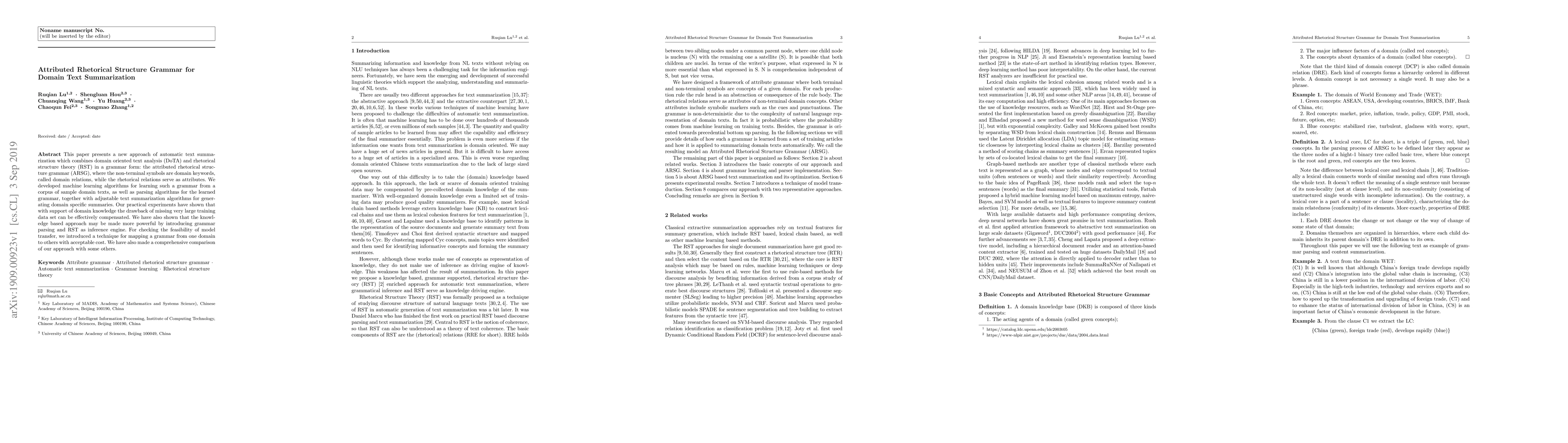 This paper introduces an attributed rhetorical structure grammar (ARSG) for domain text summarization, combining domain oriented text analysis and rhetorical structure theory. The approach effectively compensates for limited training data by leveraging domain knowledge and shows promising results in domain-specific text summarization.