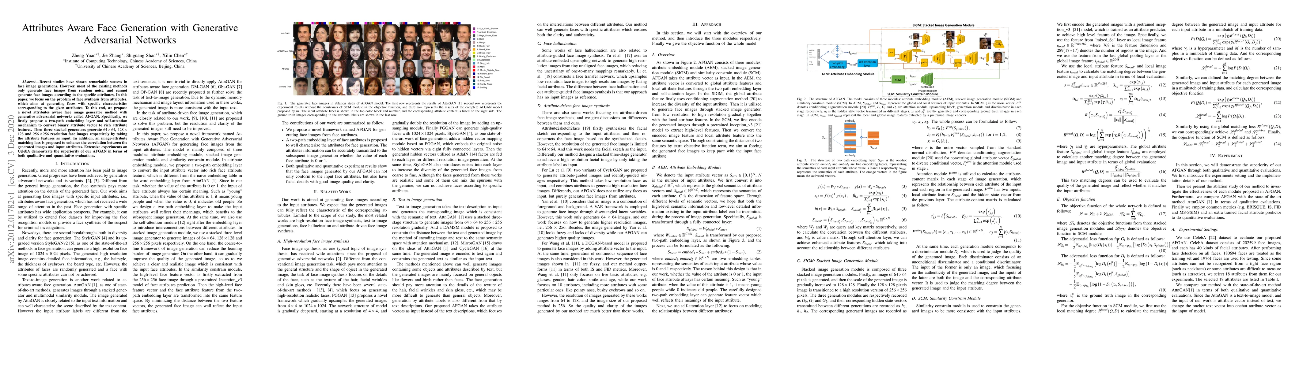 This paper introduces AFGAN, a novel face generation method using generative adversarial networks that synthesizes faces with specific attributes from binary attribute vectors. It employs a two-path embedding layer and self-attention mechanism, followed by three stacked generators to produce face images at different resolutions, with an image-attribute matching loss to enhance correlation. Experiments on CelebA show AFGAN's superior performance.