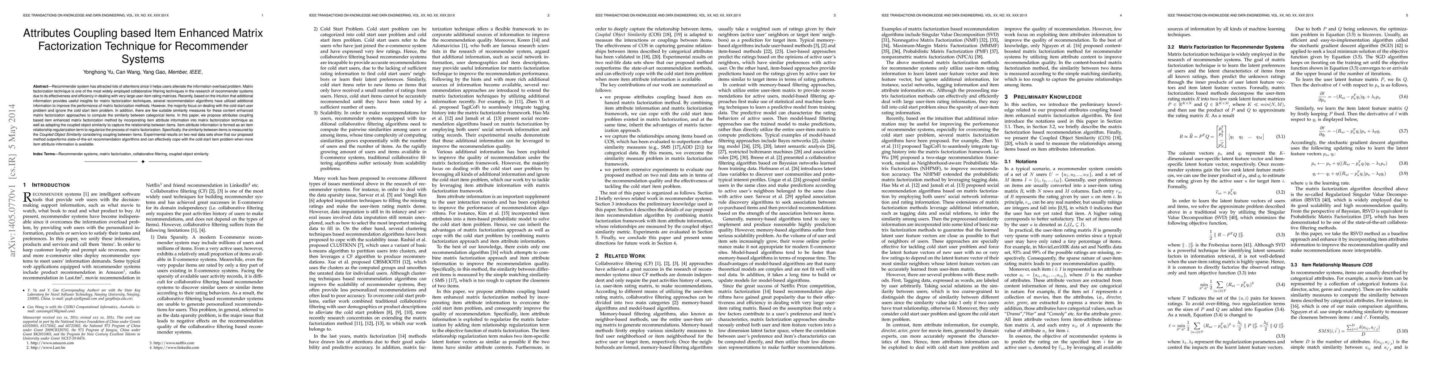 This paper proposes an attributes coupling based item enhanced matrix factorization technique to improve recommender systems by incorporating item attribute information and adapting coupled object similarity to address the cold start item problem, outperforming state-of-the-art algorithms in experiments.