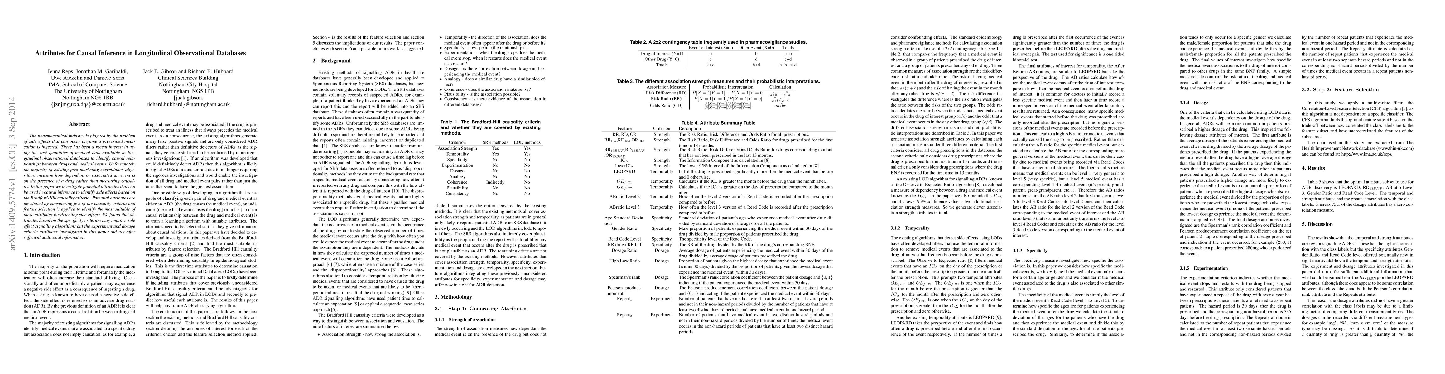 The pharmaceutical industry is plagued by the problem of side effects that can occur anytime a prescribed medication is ingested. There has been a recent interest in using the vast quantities of medical data available in longitudinal observational databases to identify causal relationships between drugs and medical events. Unfortunately the majority of existing post marketing surveillance algorithms measure how dependant or associated an event is on the presence of a drug rather than measuring causality. In this paper we investigate potential attributes that can be used in causal inference to identify side effects based on the Bradford-Hill causality criteria. Potential attributes are developed by considering five of the causality criteria and feature selection is applied to identify the most suitable of these attributes for detecting side effects. We found that attributes based on the specificity criterion may improve side effect signalling algorithms but the experiment and dosage criteria attributes investigated in this paper did not offer sufficient additional information.