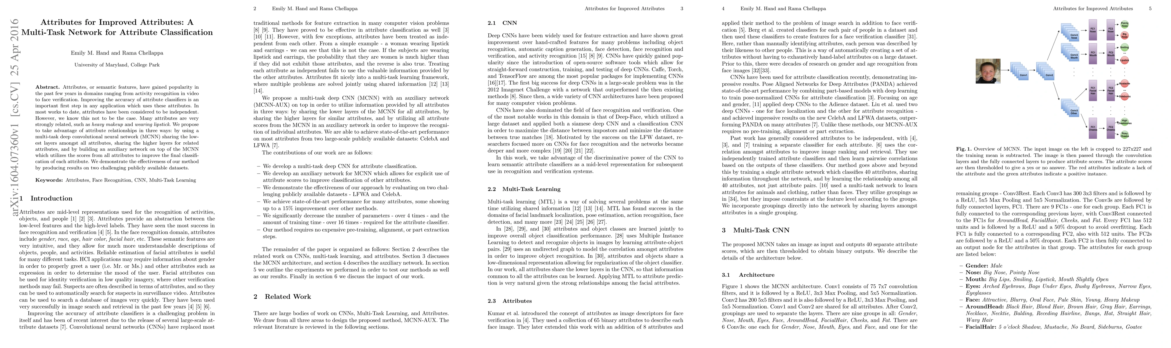 This paper proposes a multi-task network to improve the classification of related attributes by leveraging their interdependencies. The method uses a shared deep convolutional neural network with specialized layers for related attributes and an auxiliary network to enhance final classification accuracy.