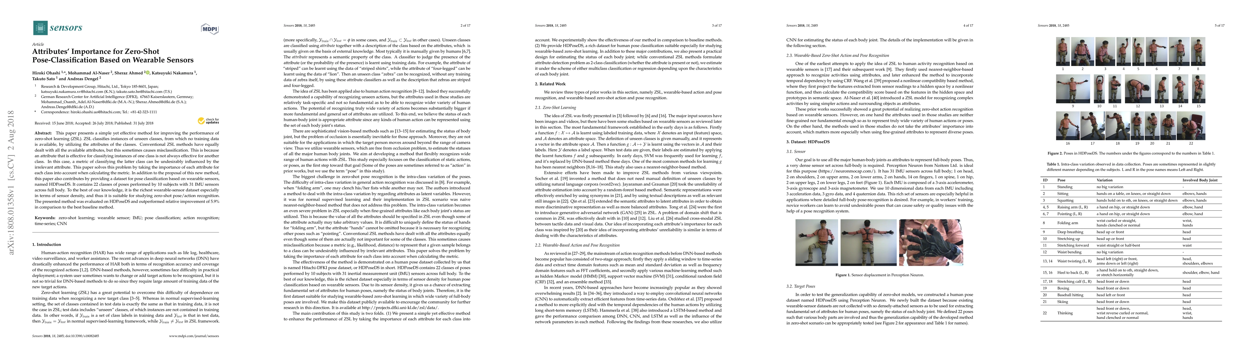 This paper introduces a method to improve zero-shot learning performance by considering the importance of attributes for each class, thus reducing misclassification. It also presents HDPoseDS, a rich dataset for zero-shot pose classification using wearable sensors, achieving a 5.9% improvement over the best baseline method.