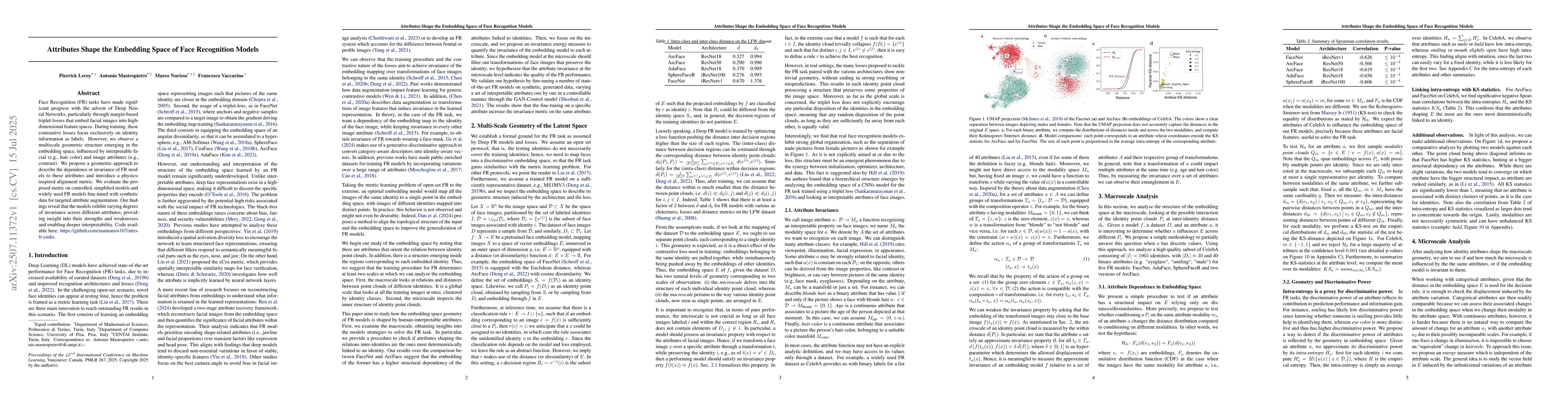 Face Recognition (FR) tasks have made significant progress with the advent of Deep Neural Networks, particularly through margin-based triplet losses that embed facial images into high-dimensional feature spaces. During training, these contrastive losses focus exclusively on identity information as labels. However, we observe a multiscale geometric structure emerging in the embedding space, influenced by interpretable facial (e.g., hair color) and image attributes (e.g., contrast). We propose a geometric approach to describe the dependence or invariance of FR models to these attributes and introduce a physics-inspired alignment metric. We evaluate the proposed metric on controlled, simplified models and widely used FR models fine-tuned with synthetic data for targeted attribute augmentation. Our findings reveal that the models exhibit varying degrees of invariance across different attributes, providing insight into their strengths and weaknesses and enabling deeper interpretability. Code available here: https://github.com/mantonios107/attrs-fr-embs}{https://github.com/mantonios107/attrs-fr-embs