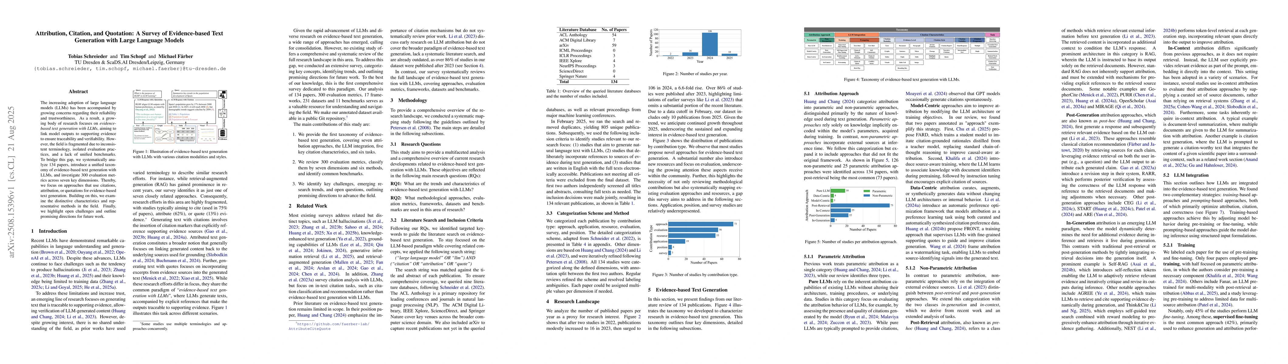 The increasing adoption of large language models (LLMs) has been accompanied by growing concerns regarding their reliability and trustworthiness. As a result, a growing body of research focuses on evidence-based text generation with LLMs, aiming to link model outputs to supporting evidence to ensure traceability and verifiability. However, the field is fragmented due to inconsistent terminology, isolated evaluation practices, and a lack of unified benchmarks. To bridge this gap, we systematically analyze 134 papers, introduce a unified taxonomy of evidence-based text generation with LLMs, and investigate 300 evaluation metrics across seven key dimensions. Thereby, we focus on approaches that use citations, attribution, or quotations for evidence-based text generation. Building on this, we examine the distinctive characteristics and representative methods in the field. Finally, we highlight open challenges and outline promising directions for future work.
