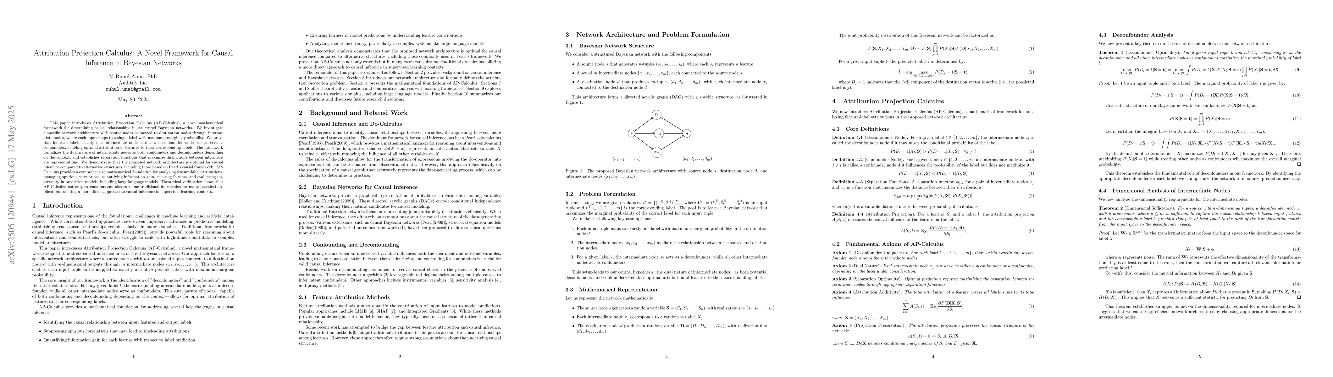This paper introduces Attribution Projection Calculus (AP-Calculus), a novel mathematical framework for determining causal relationships in structured Bayesian networks. We investigate a specific network architecture with source nodes connected to destination nodes through intermediate nodes, where each input maps to a single label with maximum marginal probability. We prove that for each label, exactly one intermediate node acts as a deconfounder while others serve as confounders, enabling optimal attribution of features to their corresponding labels. The framework formalizes the dual nature of intermediate nodes as both confounders and deconfounders depending on the context, and establishes separation functions that maximize distinctions between intermediate representations. We demonstrate that the proposed network architecture is optimal for causal inference compared to alternative structures, including those based on Pearl's causal framework. AP-Calculus provides a comprehensive mathematical foundation for analyzing feature-label attributions, managing spurious correlations, quantifying information gain, ensuring fairness, and evaluating uncertainty in prediction models, including large language models. Theoretical verification shows that AP-Calculus not only extends but can also subsume traditional do-calculus for many practical applications, offering a more direct approach to causal inference in supervised learning contexts.