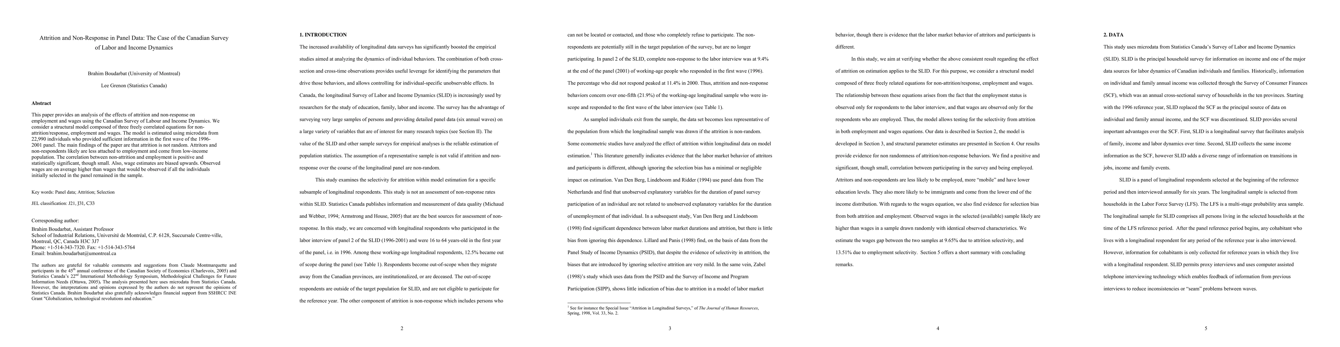 This paper provides an analysis of the effects of attrition and non-response on employment and wages using the Canadian Survey of Labour and Income Dynamics. We consider a structural model composed of three freely correlated equations for nonattrition/response, employment and wages. The model is estimated using microdata from 22,990 individuals who provided sufficient information in the first wave of the 1996-2001 panel. The main findings of the paper are that attrition is not random. Attritors and non-respondents likely are less attached to employment and come from low-income population. The correlation between non-attrition and employment is positive and statistically significant, though small. Also, wage estimates are biased upwards. Observed wages are on average higher than wages that would be observed if all the individuals initially selected in the panel remained in the sample.