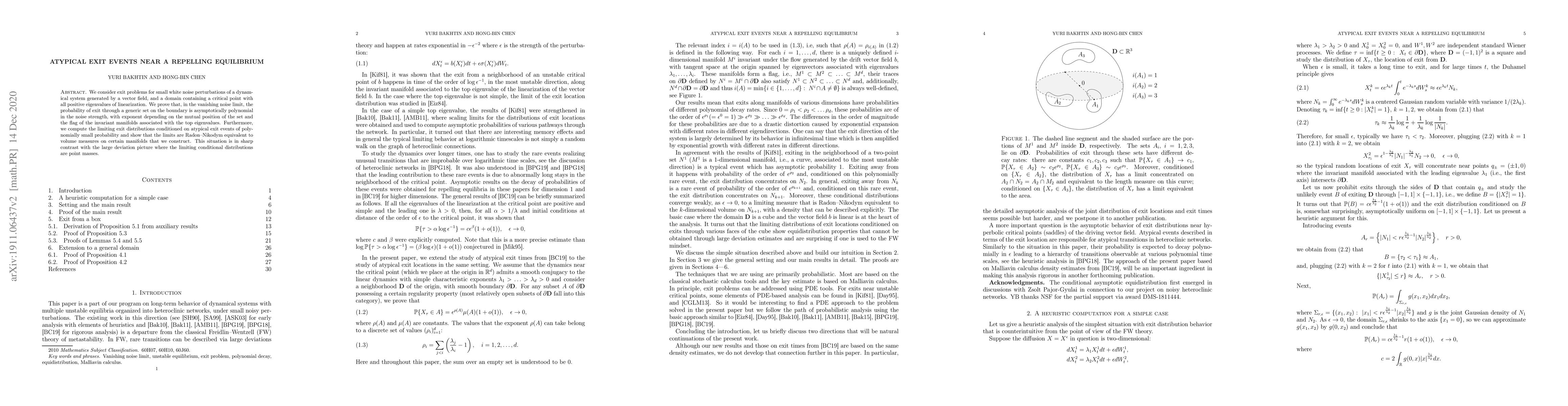 We consider exit problems for small white noise perturbations of a dynamical system generated by a vector field, and a domain containing a critical point with all positive eigenvalues of linearization. We prove that, in the vanishing noise limit, the probability of exit through a generic set on the boundary is asymptotically polynomial in the noise strength, with exponent depending on the mutual position of the set and the flag of the invariant manifolds associated with the top eigenvalues. Furthermore, we compute the limiting exit distributions conditioned on atypical exit events of polynomially small probability and show that the limits are Radon--Nikodym equivalent to volume measures on certain manifolds that we construct. This situation is in sharp contrast with the large deviation picture where the limiting conditional distributions are point masses.