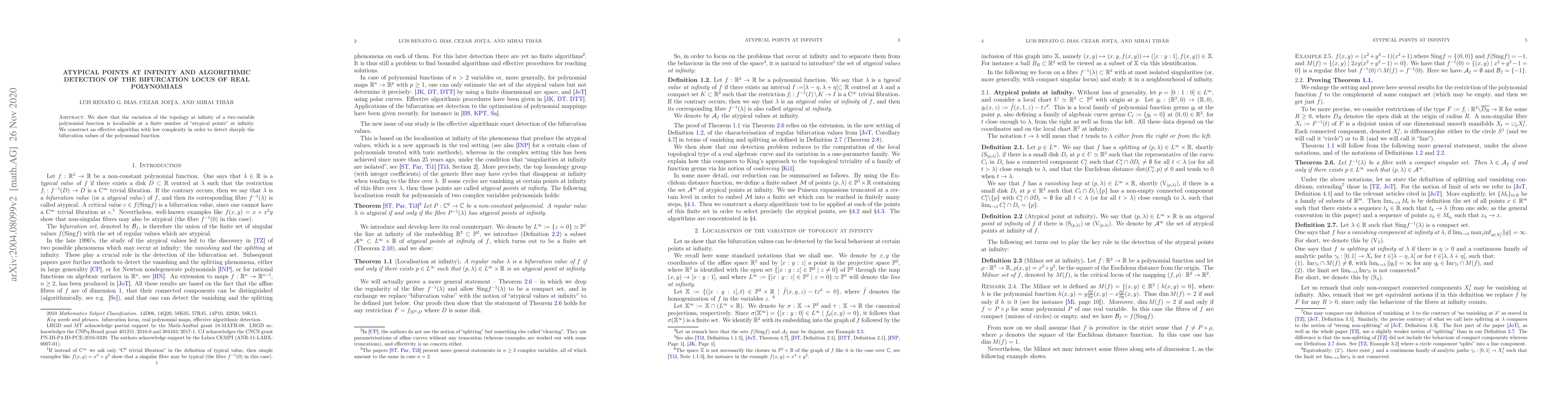 Summary: The paper identifies "atypical points" at infinity where topological changes in two-variable polynomial functions occur, and presents an efficient algorithm to detect these bifurcation points with minimal computational complexity.