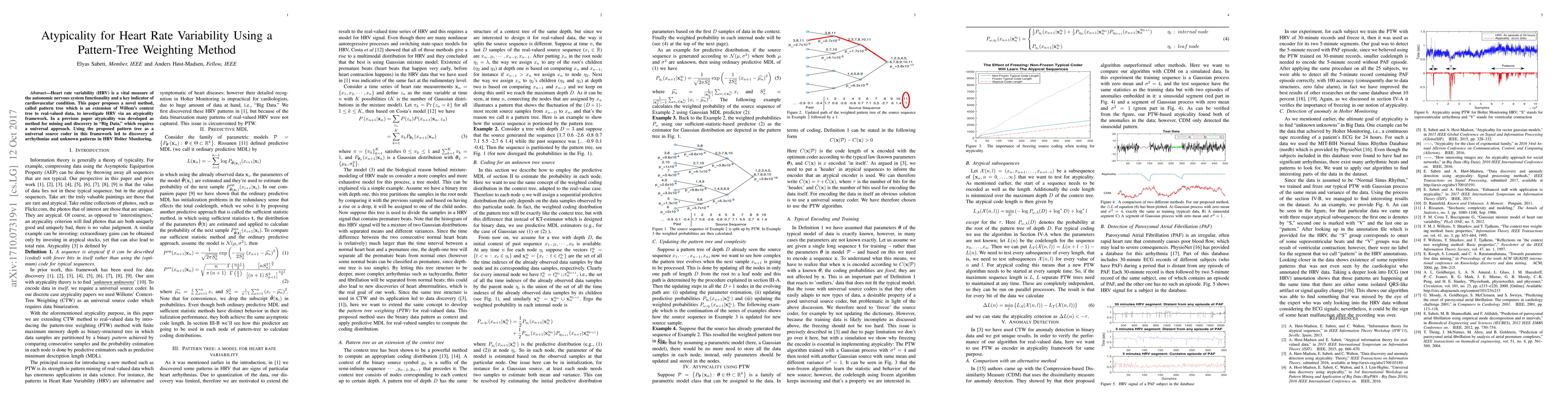Heart rate variability (HRV) is a vital measure of the autonomic nervous system functionality and a key indicator of cardiovascular condition. This paper proposes a novel method, called pattern tree which is an extension of Willem's context tree to real-valued data, to investigate HRV via an atypicality framework. In a previous paper atypicality was developed as method for mining and discovery in "Big Data," which requires a universal approach. Using the proposed pattern tree as a universal source coder in this framework led to discovery of arrhythmias and unknown patterns in HRV Holter Monitoring.