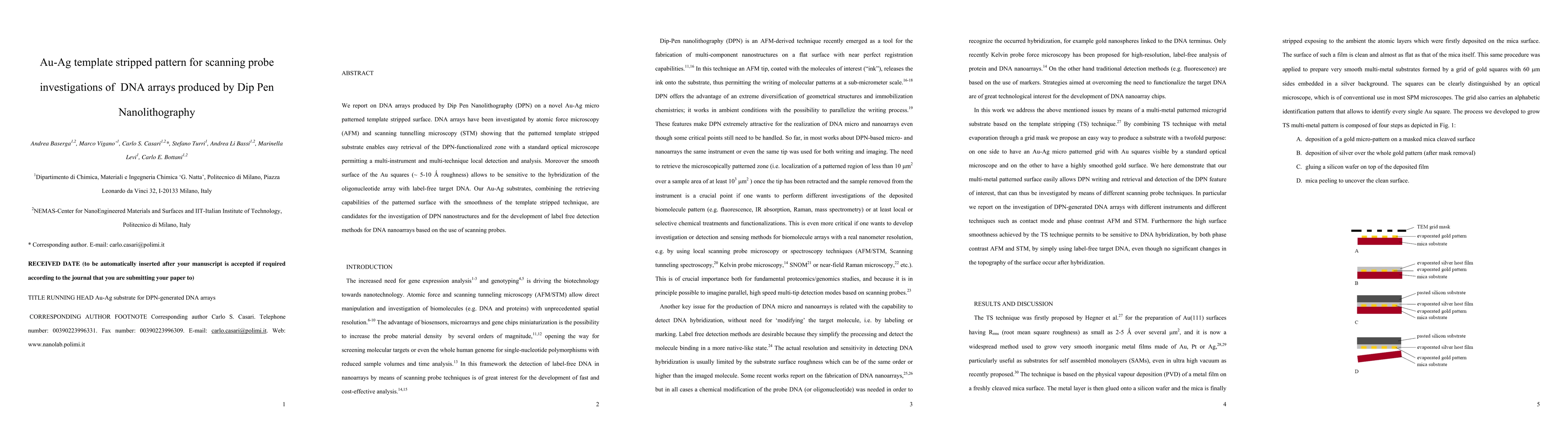 This paper presents DNA arrays created via Dip Pen Nanolithography on Au-Ag micro patterned templates, investigated using AFM and STM. The patterned template surface facilitates easy identification of DPN-functionalized zones, enabling multi-technique analysis and label-free detection of DNA hybridization.