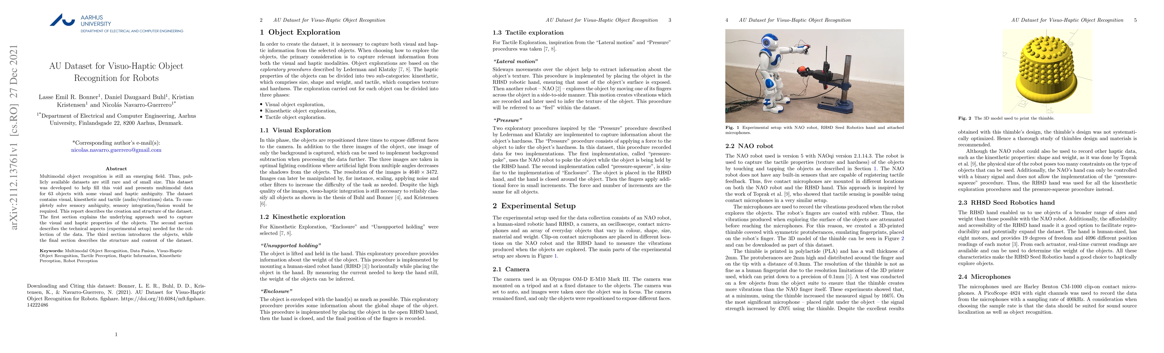 This paper introduces a new AU Dataset for Visuo-Haptic Object Recognition, providing multimodal data for 63 objects to aid in the emerging field of multimodal object recognition. The dataset includes visual, kinesthetic, and tactile data, aiming to address sensory ambiguity through sensory integration.