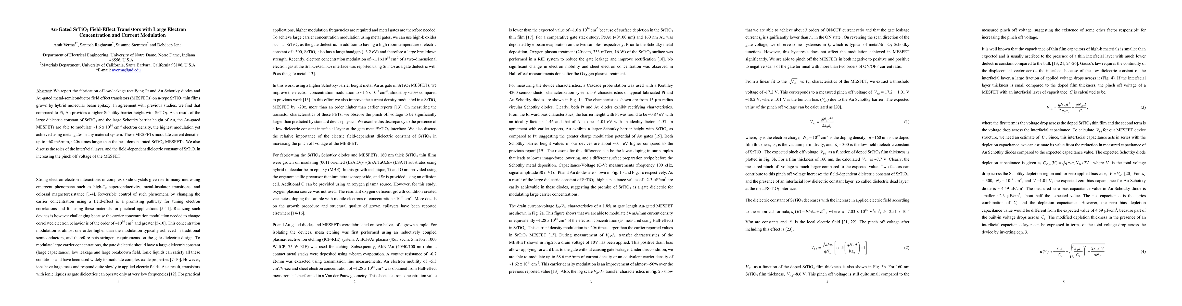 This paper details the fabrication of Au-gated SrTiO3 field-effect transistors that achieve high electron concentration and current modulation, demonstrating a ~20x improvement over previous SrTiO3 MESFETs due to the large Schottky barrier height of Au and the material's dielectric properties.
