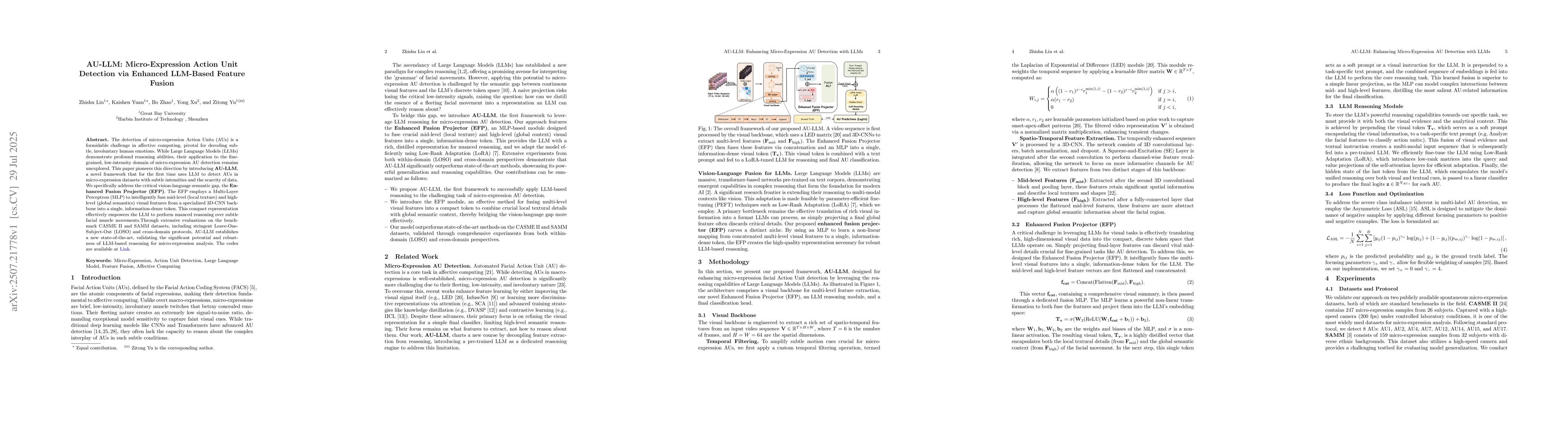The paper introduces AU-LLM, a framework that leverages Large Language Models (LLMs) for micro-expression Action Unit (AU) detection. It employs an Enhanced Fusion Projector (EFP) to bridge the vision-language semantic gap by fusing multi-level visual features into a single, information-rich token for LLM reasoning.