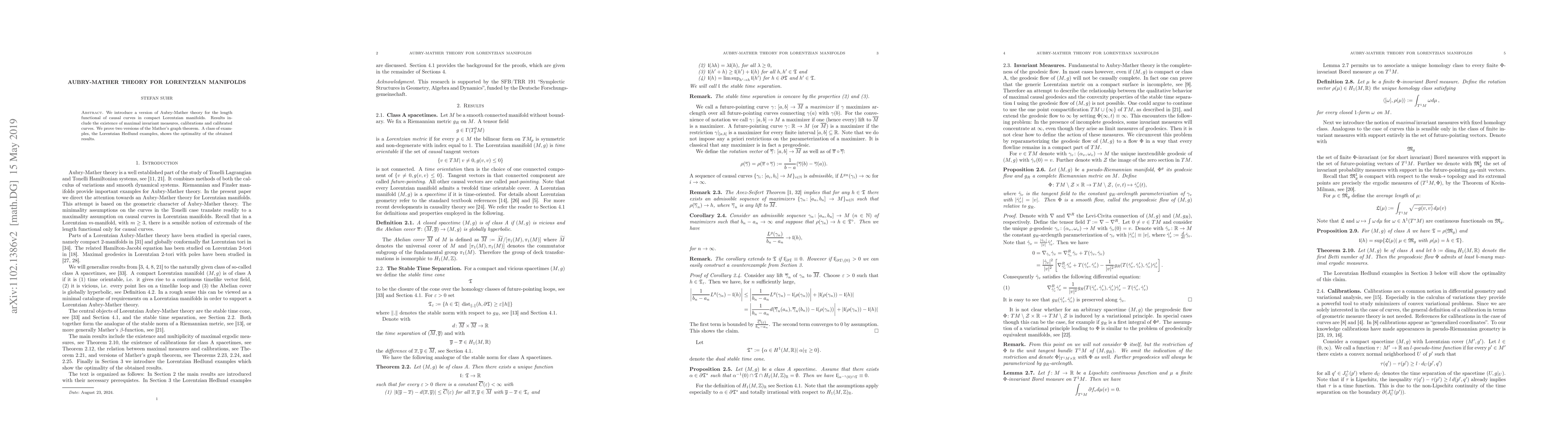 This paper develops Aubry-Mather theory for causal curves in compact Lorentzian manifolds, establishing maximal invariant measures, calibrations, and calibrated curves. It proves two versions of Mather's graph theorem and demonstrates the optimality of results using Lorentzian Hedlund examples.