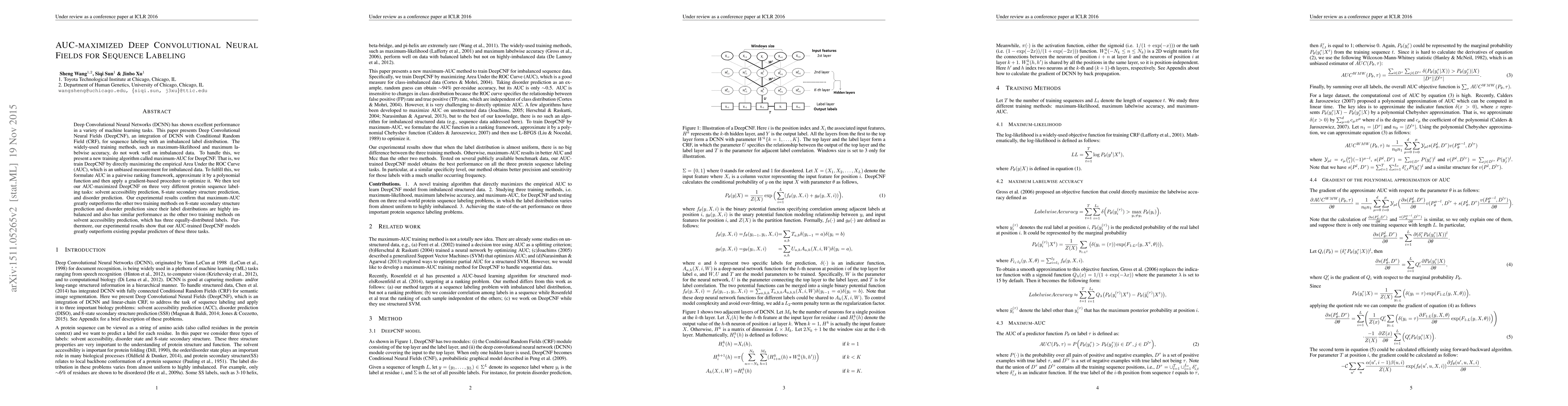 Deep Convolutional Neural Networks (DCNN) has shown excellent performance in a variety of machine learning tasks. This manuscript presents Deep Convolutional Neural Fields (DeepCNF), a combination of DCNN with Conditional Random Field (CRF), for sequence labeling with highly imbalanced label distribution. The widely-used training methods, such as maximum-likelihood and maximum labelwise accuracy, do not work well on highly imbalanced data. To handle this, we present a new training algorithm called maximum-AUC for DeepCNF. That is, we train DeepCNF by directly maximizing the empirical Area Under the ROC Curve (AUC), which is an unbiased measurement for imbalanced data. To fulfill this, we formulate AUC in a pairwise ranking framework, approximate it by a polynomial function and then apply a gradient-based procedure to optimize it. We then test our AUC-maximized DeepCNF on three very different protein sequence labeling tasks: solvent accessibility prediction, 8-state secondary structure prediction, and disorder prediction. Our experimental results confirm that maximum-AUC greatly outperforms the other two training methods on 8-state secondary structure prediction and disorder prediction since their label distributions are highly imbalanced and also have similar performance as the other two training methods on the solvent accessibility prediction problem which has three equally-distributed labels. Furthermore, our experimental results also show that our AUC-trained DeepCNF models greatly outperform existing popular predictors of these three tasks.