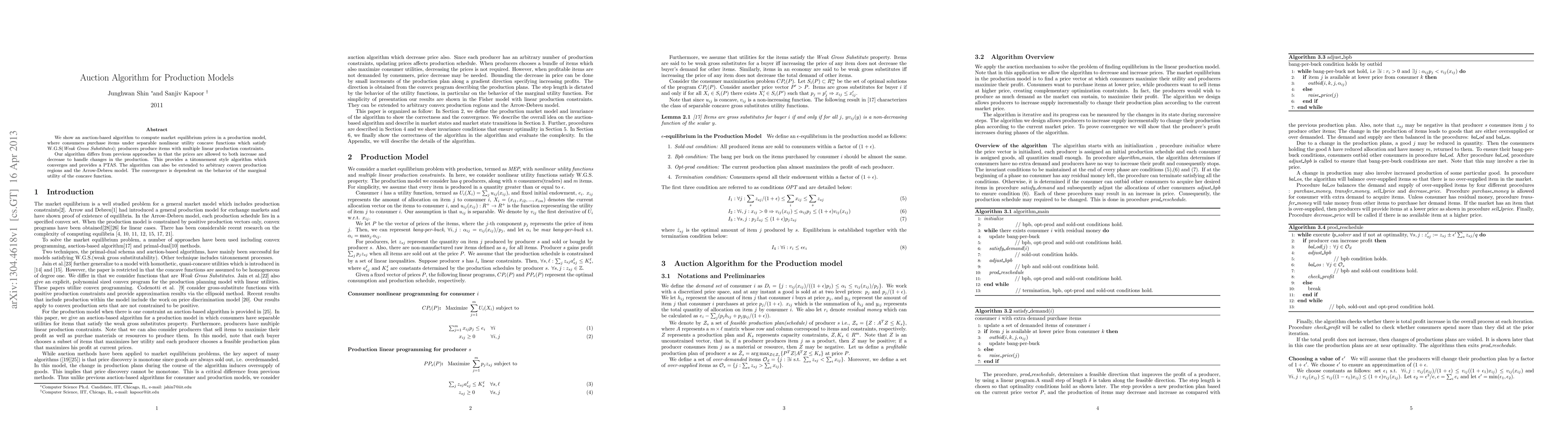 This paper proposes an auction-based algorithm to determine market equilibrium prices in a production model with nonlinear utility functions and multiple linear production constraints. Unlike previous methods, the algorithm allows prices to fluctuate to adapt to production changes, ensuring convergence and providing a PTAS.
