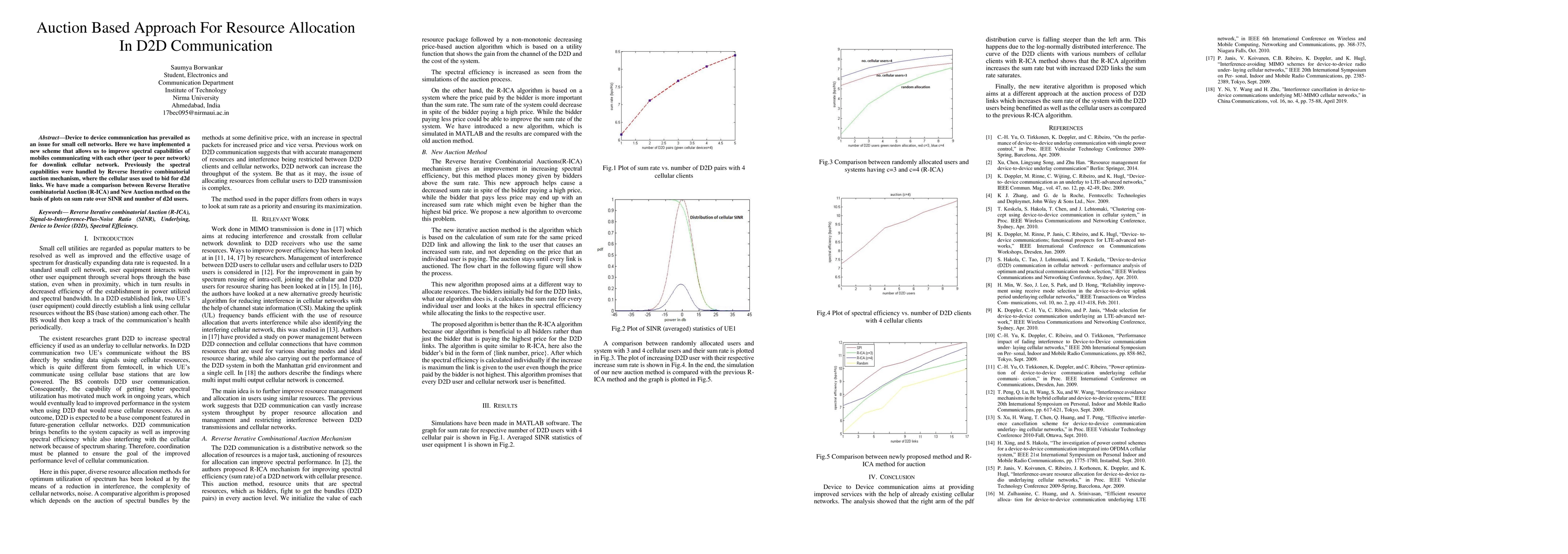 This paper proposes a new auction-based approach for resource allocation in device-to-device (D2D) communication to enhance spectral efficiency in small cell networks. It compares the new method with the Reverse Iterative combinatorial Auction (R-ICA) based on sum rate over SINR and the number of D2D users.
