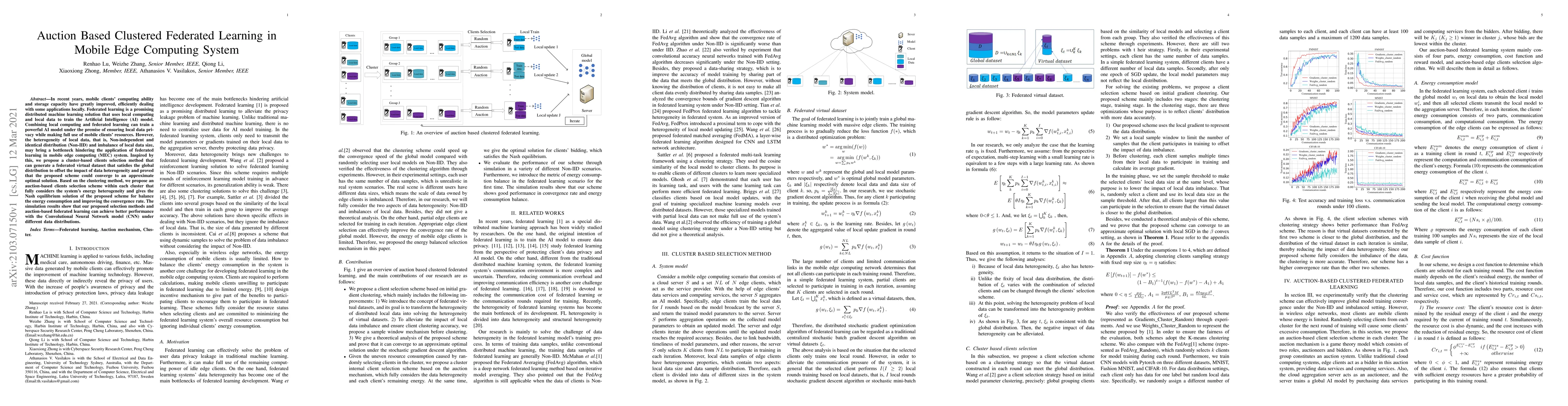 This paper proposes an auction-based clustered federated learning method for mobile edge computing to address data heterogeneity issues. It introduces a cluster-based client selection scheme to generate a federated virtual dataset that aligns with global distribution, followed by an auction-based selection within clusters to balance energy consumption and improve convergence rates, achieving better performance with CNN models.
