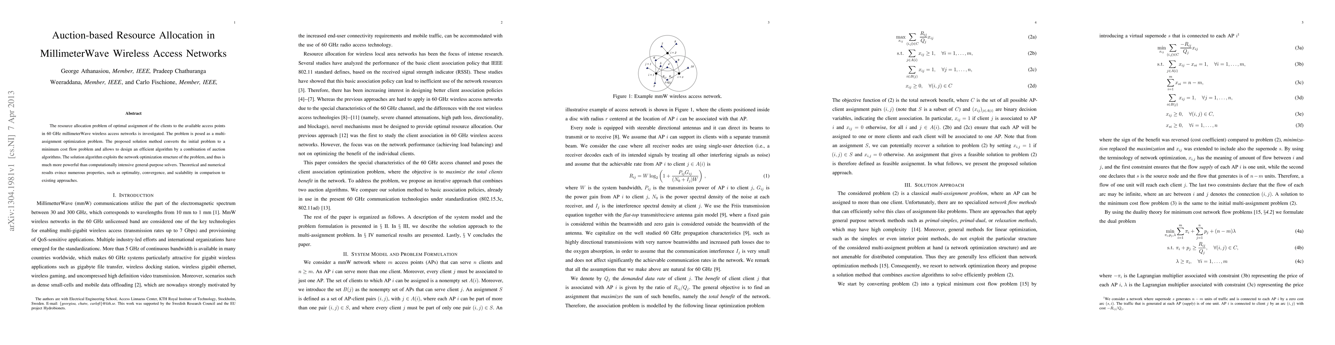 The resource allocation problem of optimal assignment of the clients to the available access points in 60 GHz millimeterWave wireless access networks is investigated. The problem is posed as a multiassignment optimisation problem. The proposed solution method converts the initial problem to a minimum cost flow problem and allows to design an efficient algorithm by a combination of auction algorithms. The solution algorithm exploits the network optimization structure of the problem, and thus is much more powerful than computationally intensive general-purpose solvers. Theoretical and numerical results evince numerous properties, such as optimality, convergence, and scalability in comparison to existing approaches.