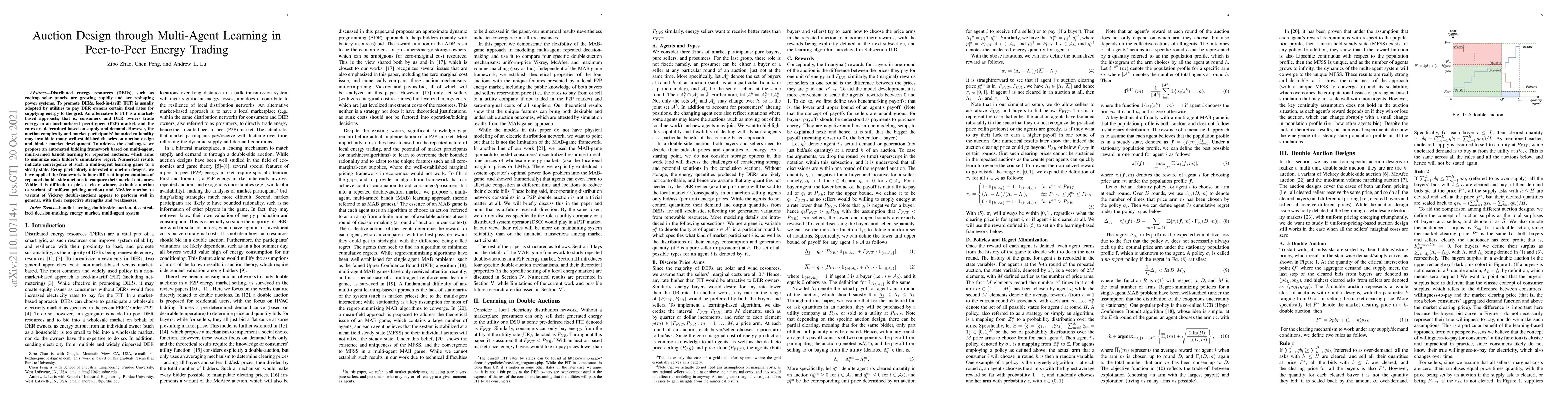 This paper proposes a multi-agent learning framework to design auctions for peer-to-peer energy trading, aiming to minimize cumulative regret through repeated auctions. The study compares four auction implementations, with the $k$-double and McAfee auctions showing promising performance.