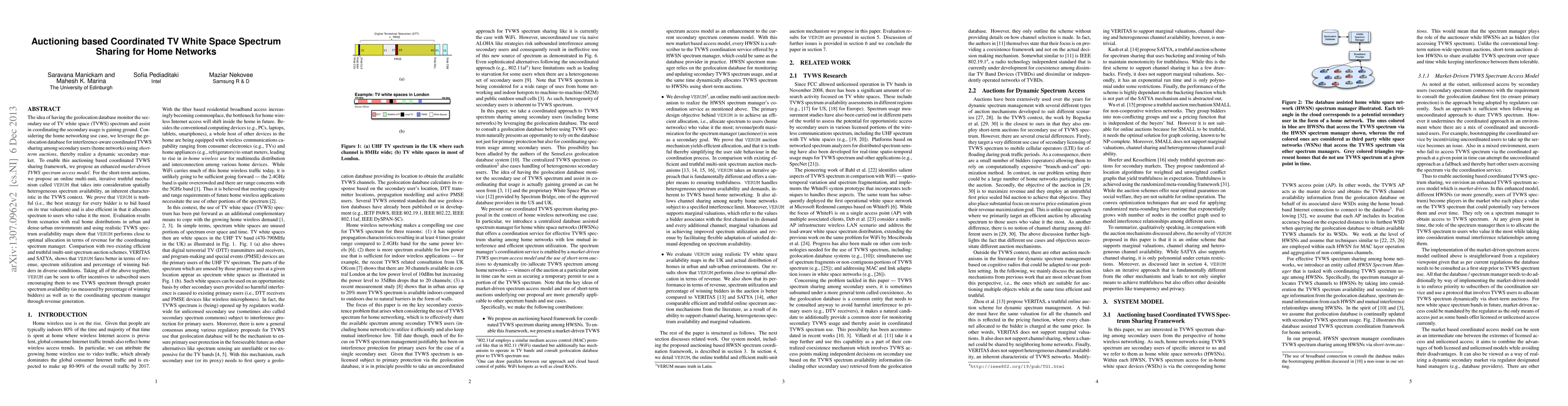 This paper proposes an auction-based coordinated spectrum sharing framework for home networks using TV white space, leveraging a geolocation database to manage interference. The introduced VERUM auction mechanism is efficient and truthful, achieving optimal spectrum allocation and higher revenue compared to existing methods, thus incentivizing both users and spectrum managers.