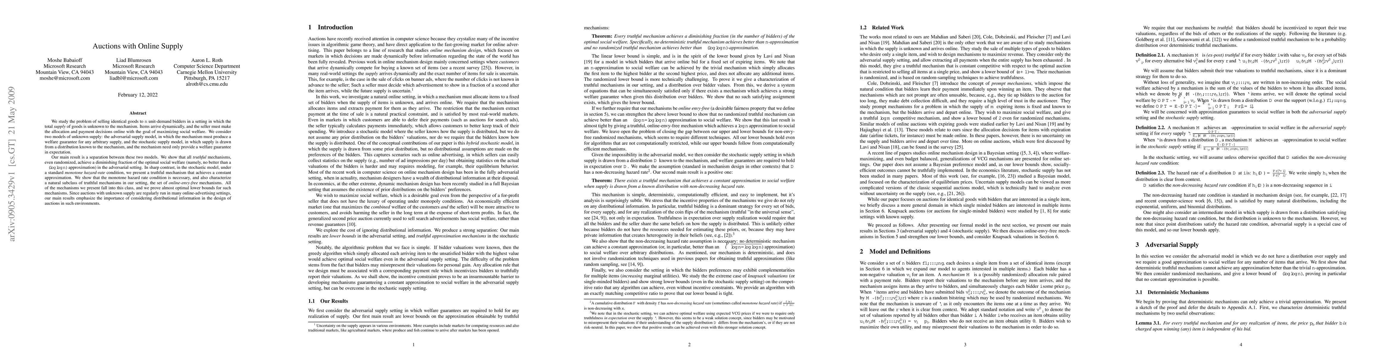 The paper introduces a deterministic truthful mechanism for the stochastic supply model under a monotone hazard-rate condition, achieving a 1678-approximation to social welfare, and characterizes the class of online-envy-free mechanisms.