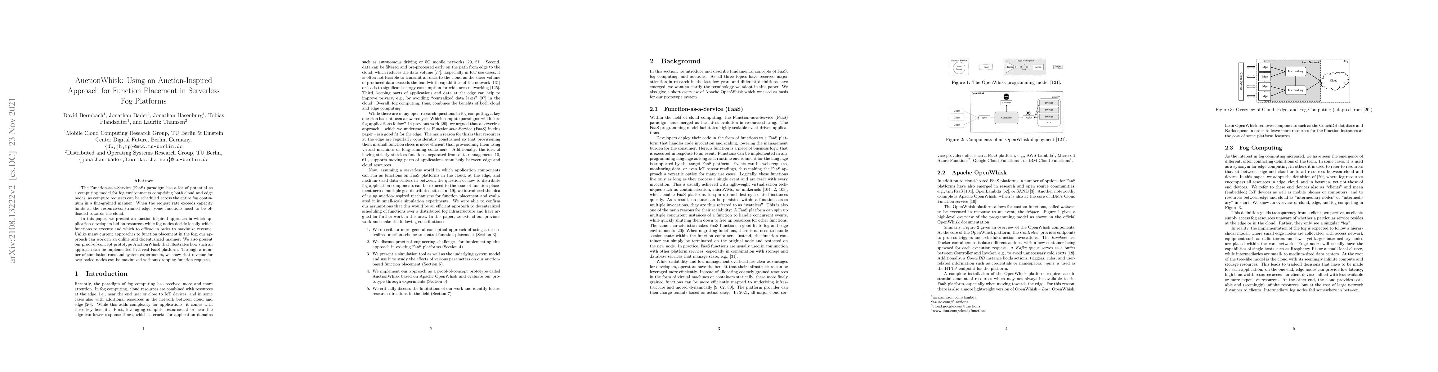 This paper introduces AuctionWhisk, an auction-inspired method for function placement in serverless fog platforms, enabling decentralized and online resource allocation to maximize revenue for overloaded nodes without dropping function requests. The prototype demonstrates its practical implementation and effectiveness through simulations and experiments.