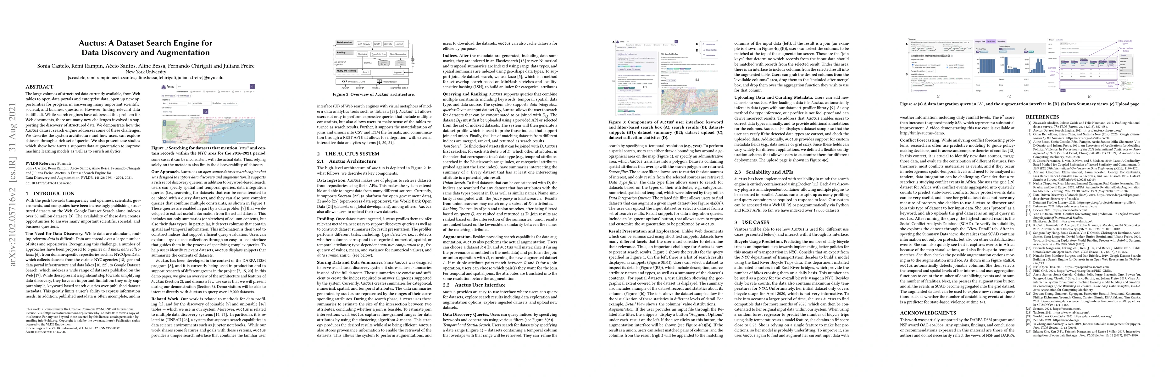 Auctus is a dataset search engine that helps users find relevant structured data for scientific, societal, and business questions. It supports data augmentation to improve machine learning models and enrich analytics.