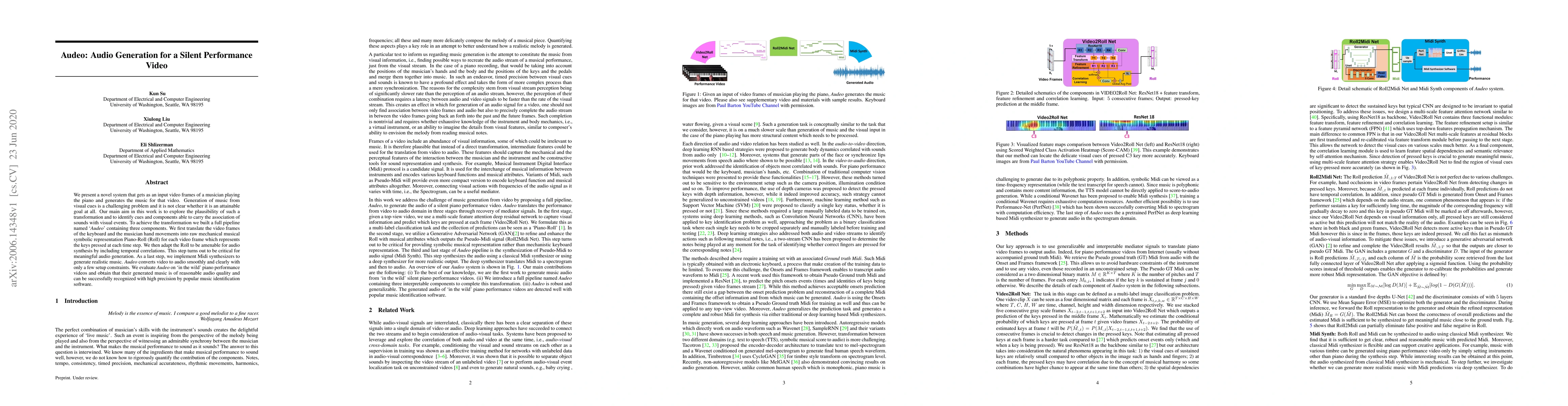 The paper introduces `Audeo,' a system that converts silent piano performance videos into corresponding music by translating visual cues into a Piano-Roll representation, adapting it for audio synthesis, and generating realistic audio using Midi synthesizers. The system demonstrates reasonable audio quality and high recognition precision for generated music.