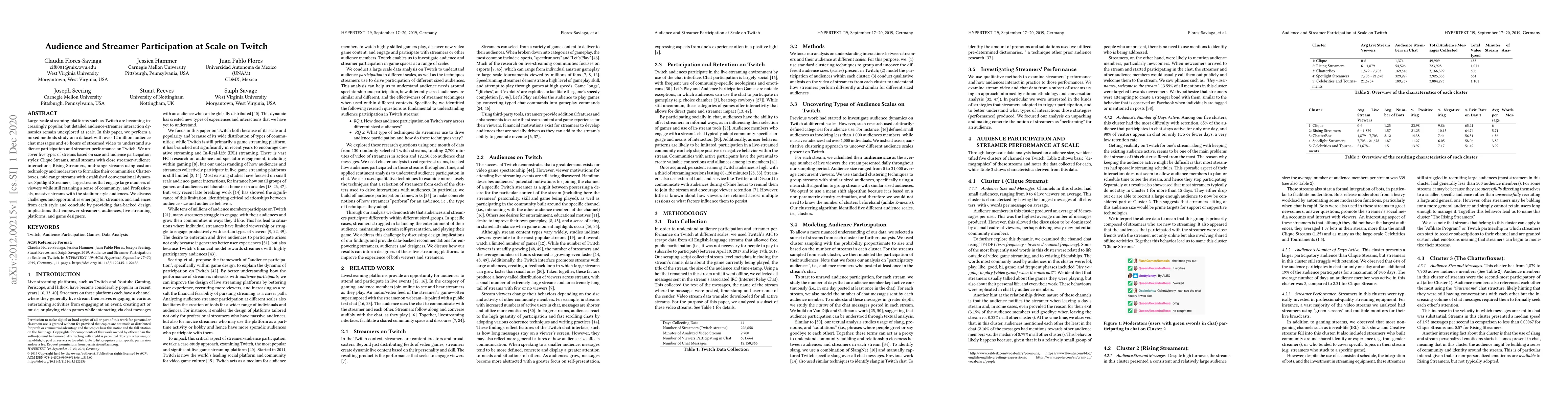 This paper explores the dynamics of audience participation and streamer performance on Twitch through a mixed-methods study involving over 12 million chat messages and 45 hours of streaming video. It identifies five types of streams based on audience size and interaction styles, offering insights into the challenges and opportunities for streamers and audiences in each category.