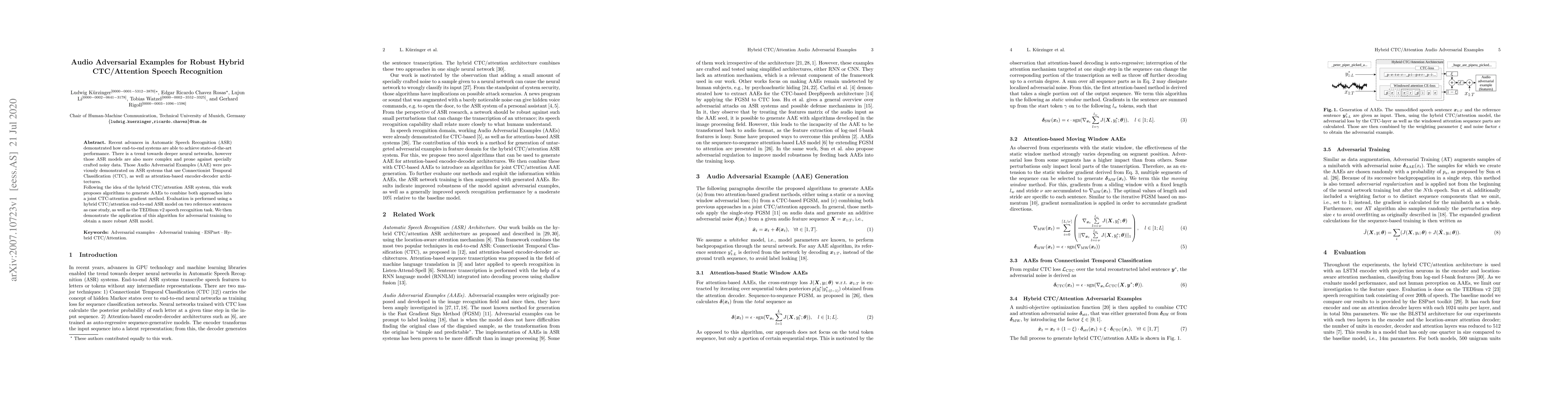 This paper proposes algorithms for generating Audio Adversarial Examples (AAEs) to improve the robustness of hybrid CTC/attention Automatic Speech Recognition (ASR) systems. It evaluates the effectiveness of the proposed AAEs on a hybrid ASR model and demonstrates their use in adversarial training to enhance model robustness.