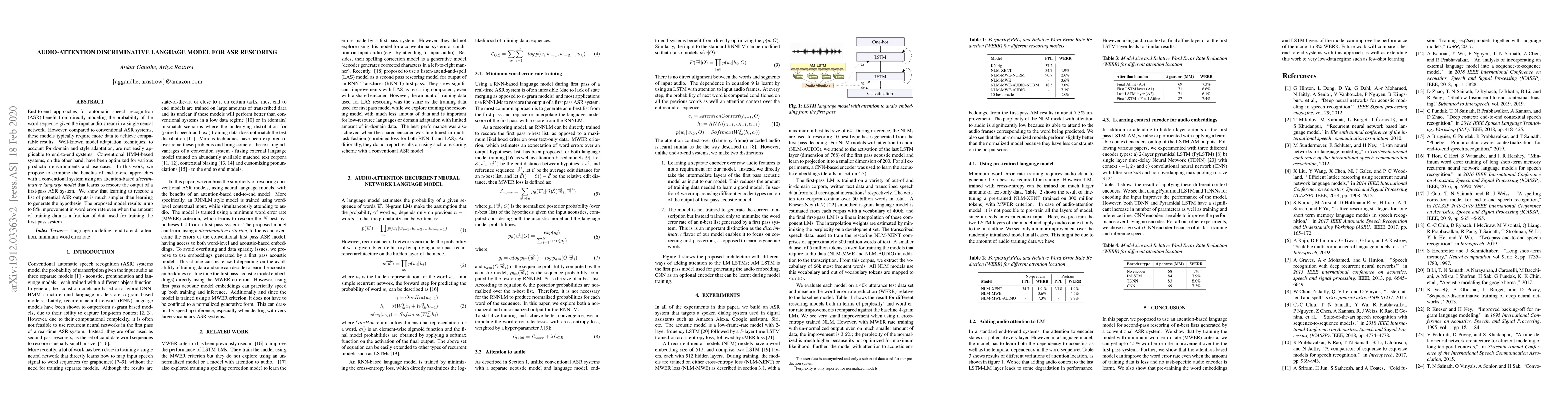 This paper proposes an audio-attention discriminative language model to rescore outputs from a first-pass ASR system, combining the benefits of end-to-end ASR approaches with conventional systems. The model achieves an 8% reduction in word error rate with significantly less training data.