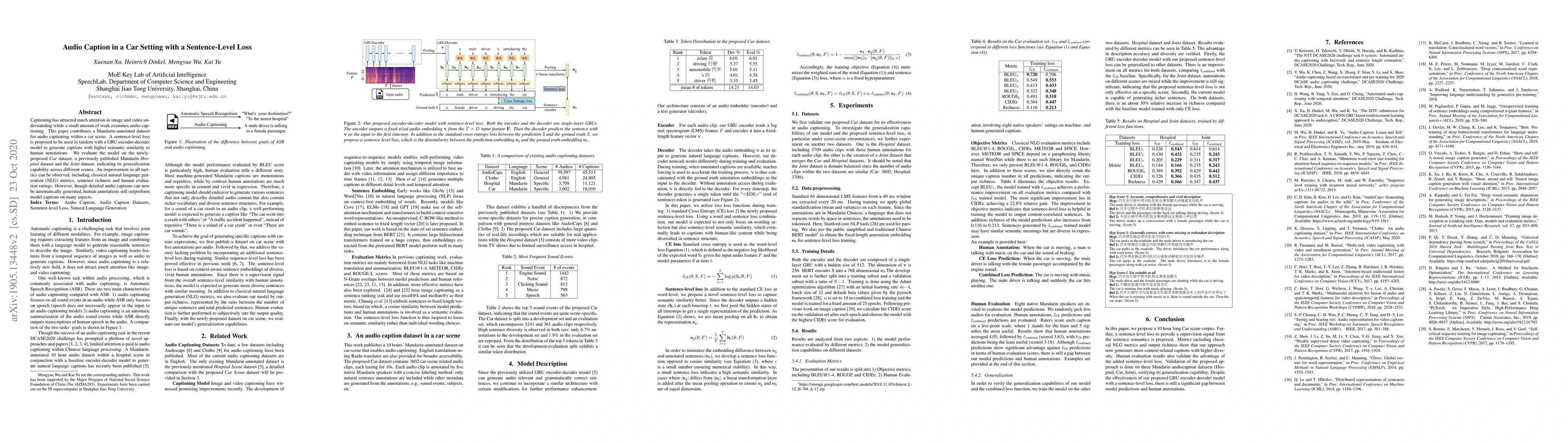Captioning has attracted much attention in image and video understanding while a small amount of work examines audio captioning. This paper contributes a Mandarin-annotated dataset for audio captioning within a car scene. A sentence-level loss is proposed to be used in tandem with a GRU encoder-decoder model to generate captions with higher semantic similarity to human annotations. We evaluate the model on the newly-proposed Car dataset, a previously published Mandarin Hospital dataset and the Joint dataset, indicating its generalization capability across different scenes. An improvement in all metrics can be observed, including classical natural language generation (NLG) metrics, sentence richness and human evaluation ratings. However, though detailed audio captions can now be automatically generated, human annotations still outperform model captions on many aspects.