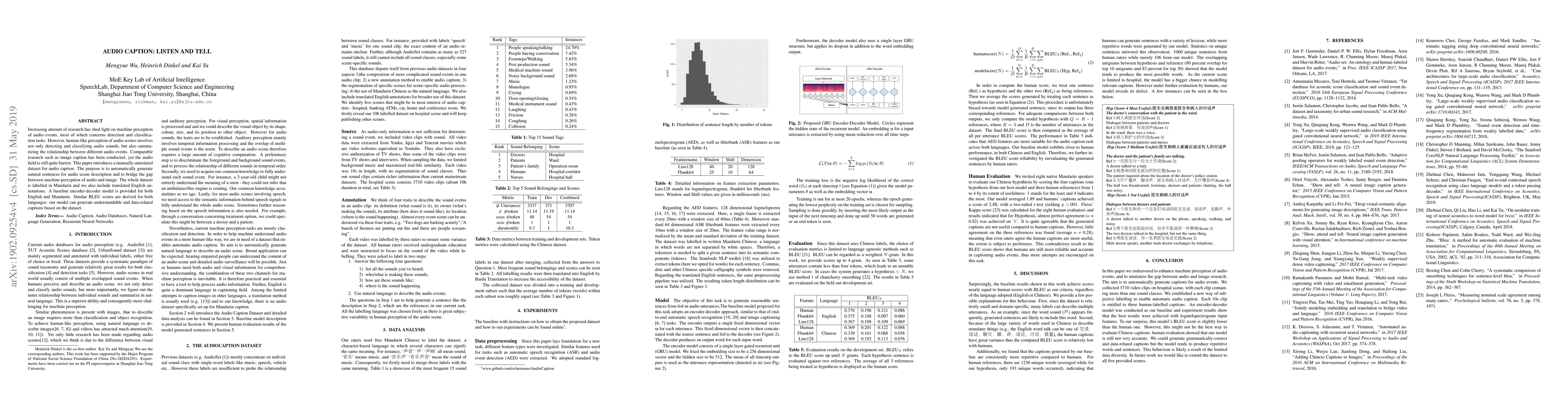 This paper introduces a manually-annotated dataset for audio captioning to bridge the gap between machine perception of audio and image. It presents a baseline encoder-decoder model that generates understandable captions for both Mandarin and English audio scenes, achieving comparable BLEU scores.