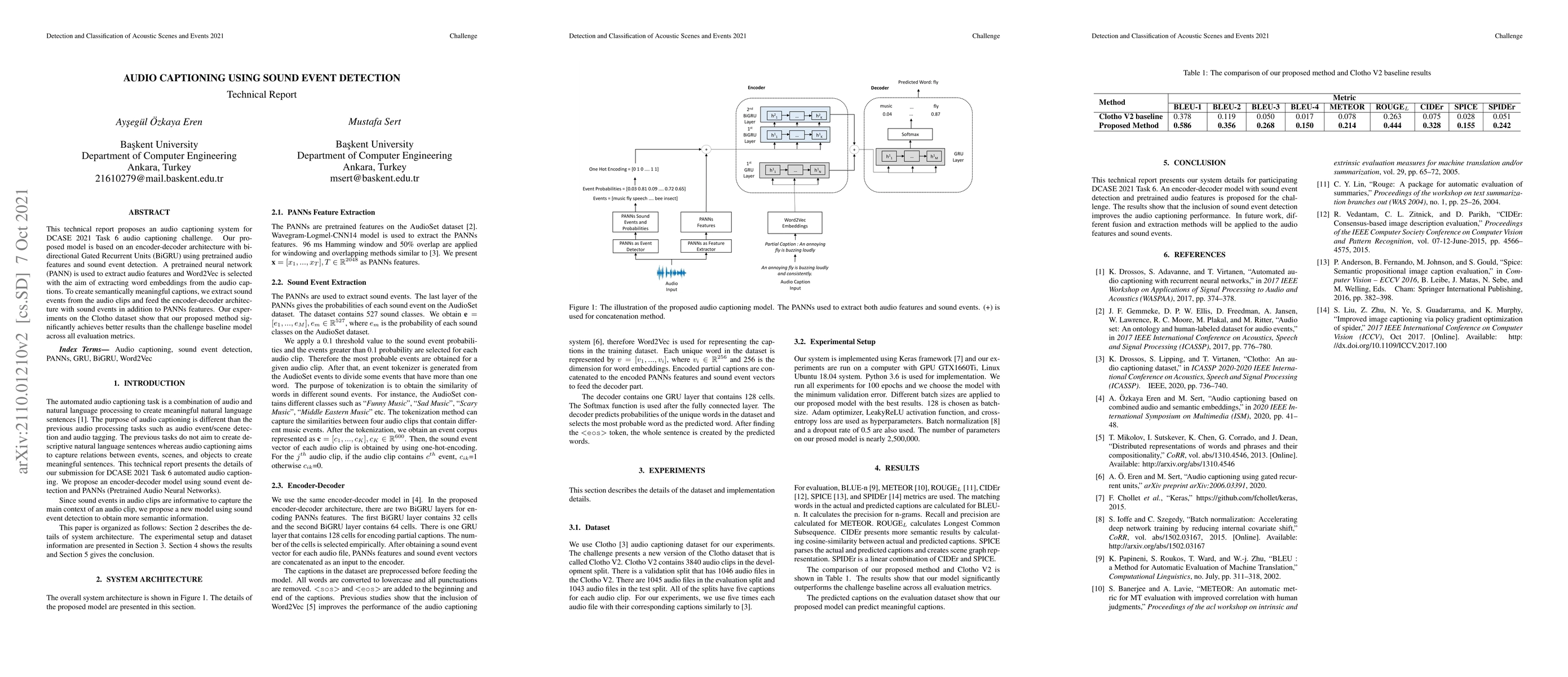 This technical report proposes an audio captioning system for DCASE 2021 Task 6 audio captioning challenge. Our proposed model is based on an encoder-decoder architecture with bi-directional Gated Recurrent Units (BiGRU) using pretrained audio features and sound event detection. A pretrained neural network (PANN) is used to extract audio features and Word2Vec is selected with the aim of extracting word embeddings from the audio captions. To create semantically meaningful captions, we extract sound events from the audio clips and feed the encoder-decoder architecture with sound events in addition to PANNs features. Our experiments on the Clotho dataset show that our proposed method significantly achieves better results than the challenge baseline model across all evaluation metrics.