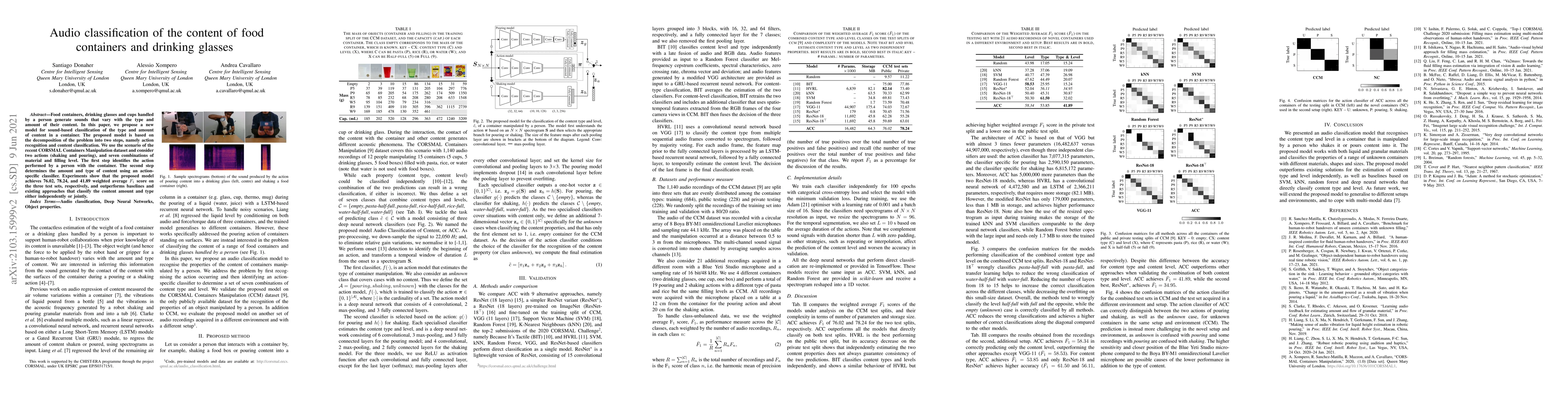 This paper proposes a new model for sound-based classification of food container contents, dividing the task into action recognition and content classification. Experiments show the model achieves a weighted average F1 score of 76.02, 78.24, and 41.89, outperforming existing methods.