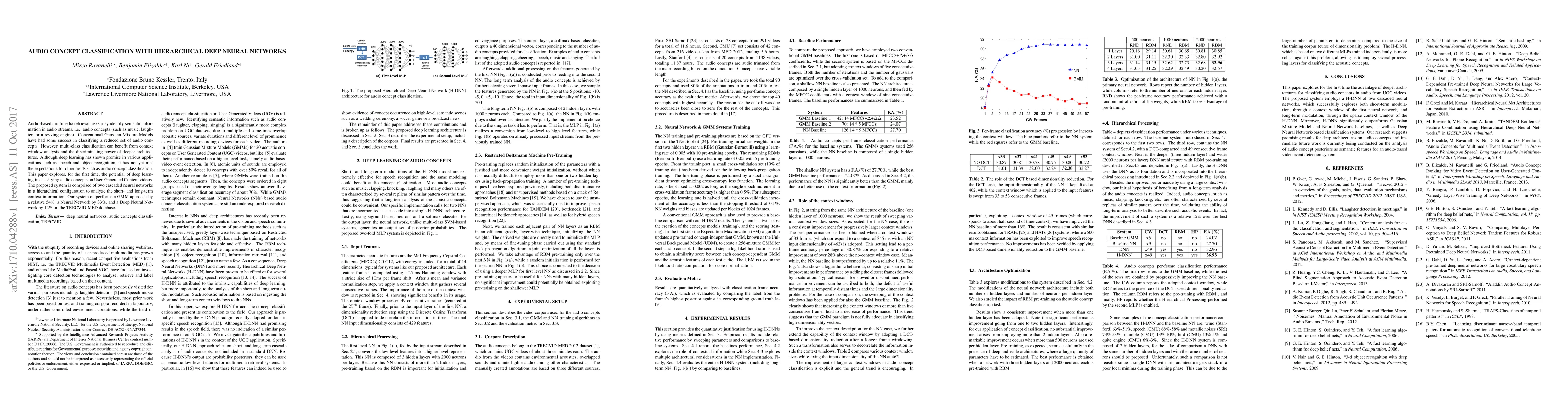 This paper proposes a hierarchical deep neural network for classifying audio concepts in multimedia content, outperforming traditional Gaussian-Mixture-Models and various neural network approaches by significant margins on the TRECVID-MED database. The system leverages deep learning to analyze both short- and long-term context in audio streams.