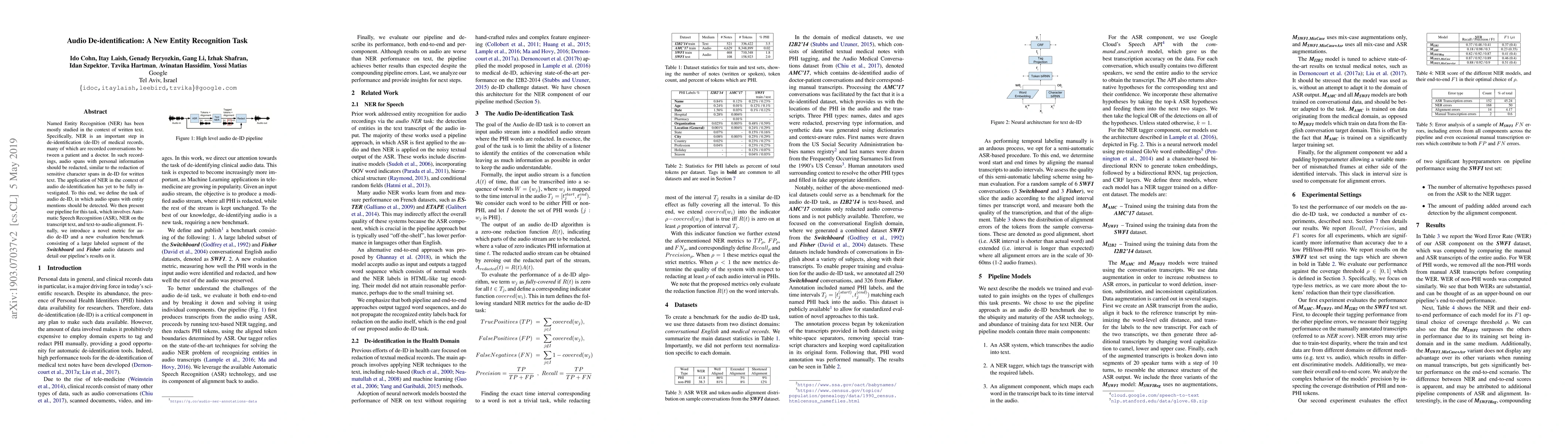 This paper introduces the novel task of audio de-identification, extending Named Entity Recognition (NER) from text to audio, where spans with personal information in speech recordings need to be redacted. The authors propose a pipeline involving Automatic Speech Recognition, NER on transcript text, and text-to-audio alignment, along with a new evaluation metric and benchmark dataset.
