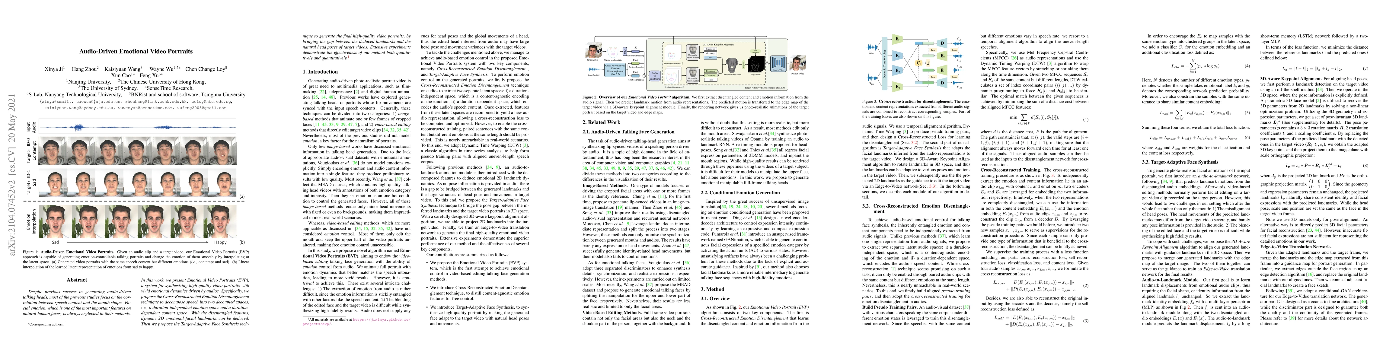 This paper introduces Emotional Video Portraits (EVP), a system that synthesizes high-quality video portraits with dynamic emotional expressions driven by audio. It employs Cross-Reconstructed Emotion Disentanglement to separate speech into emotion and content, and uses Target-Adaptive Face Synthesis to generate realistic video portraits by aligning emotional landmarks with target head poses.