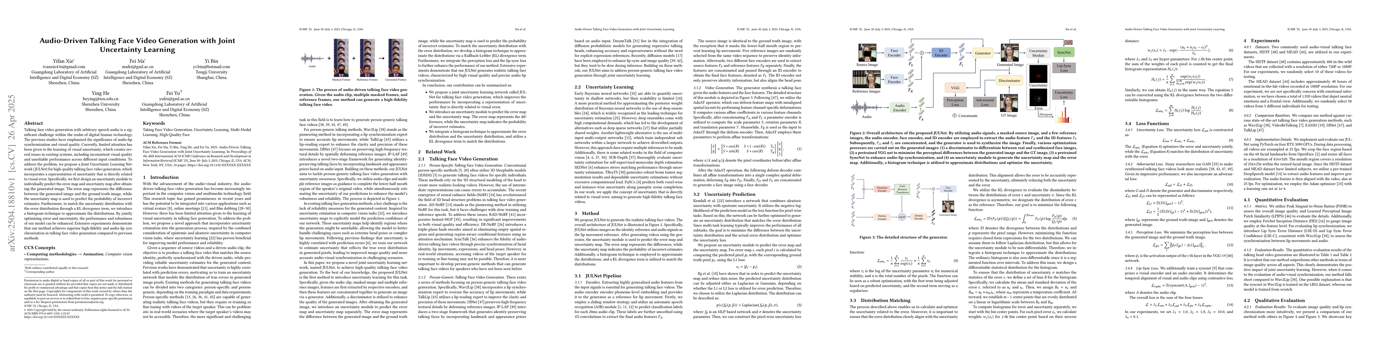 This paper proposes a Joint Uncertainty Learning Network (JULNet) to generate high-quality talking face videos with audio-driven synchronization. The model includes an uncertainty module to predict error and uncertainty maps, enhancing performance and robustness by jointly optimizing error and uncertainty through KL divergence and histogram techniques.